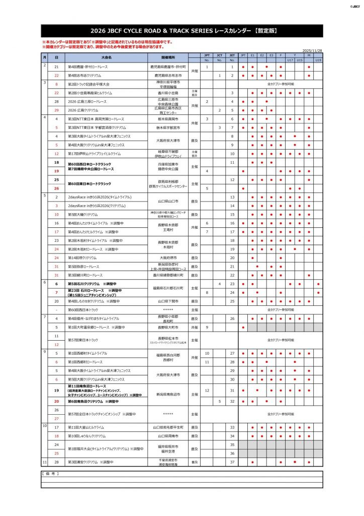 2026年レースカレンダーを公開しました。 現時点での暫定版カレンダーのため、日程調整中の大会があります。 開催カテゴリーも調整中のため変更になる場合がありますので、予めご了承下さい。 決まり次第、カレンダーを更新します。 レースカレンダー2026暫定版(PDF)
