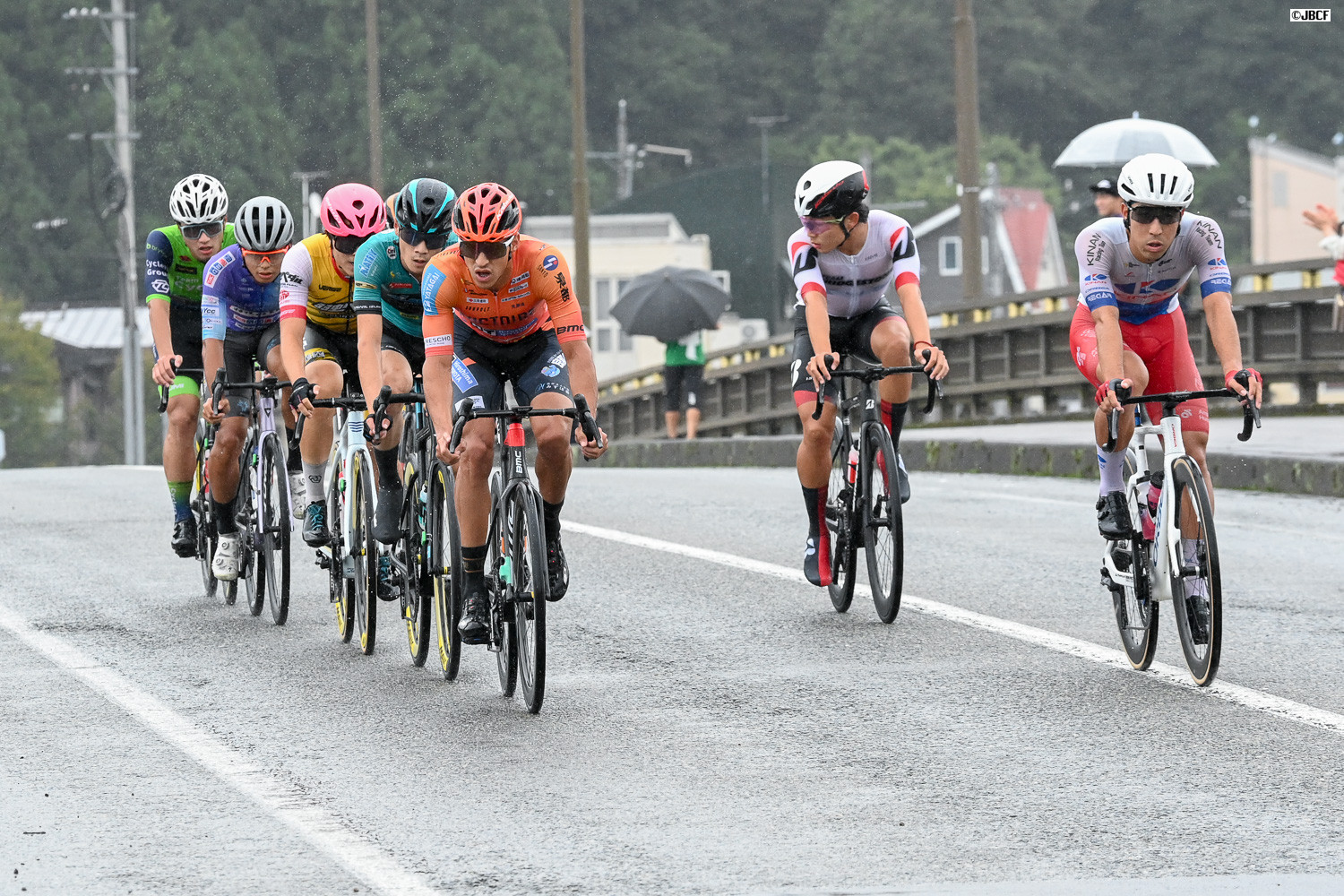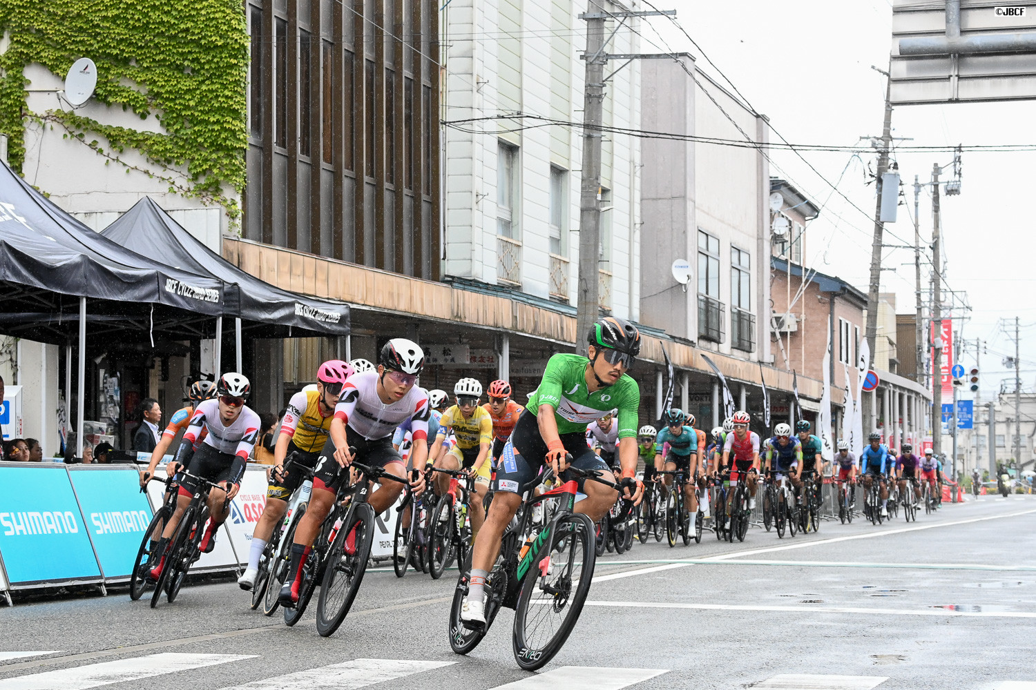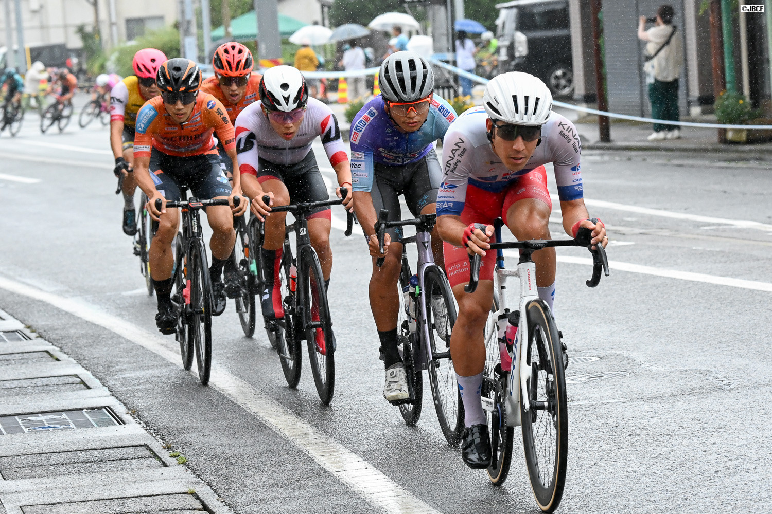 レース終盤、クリテリウムリーダージャージの孫崎大樹(ヴィクトワール広島)自ら集団先頭を牽引