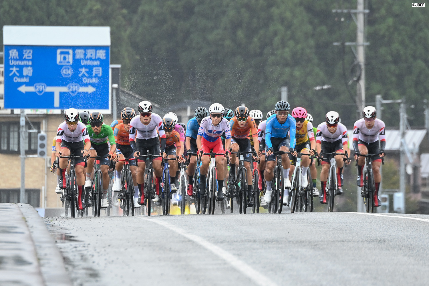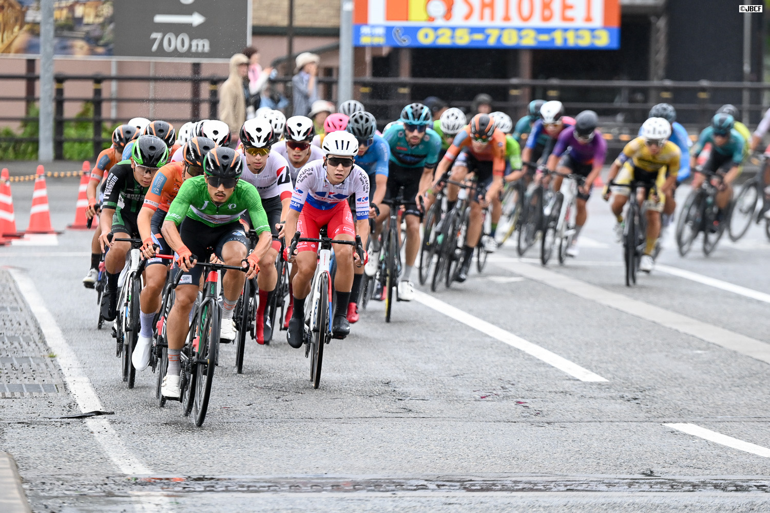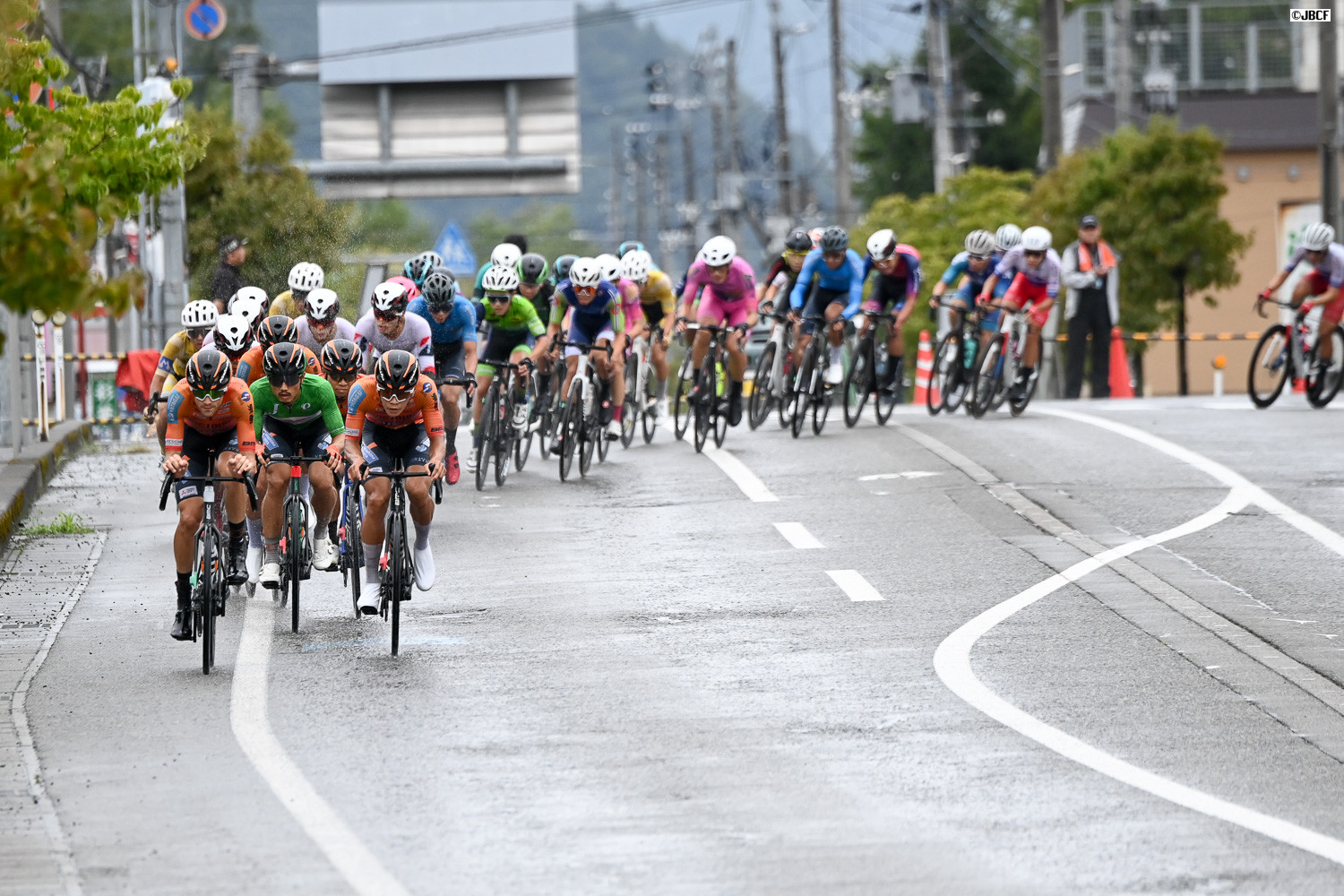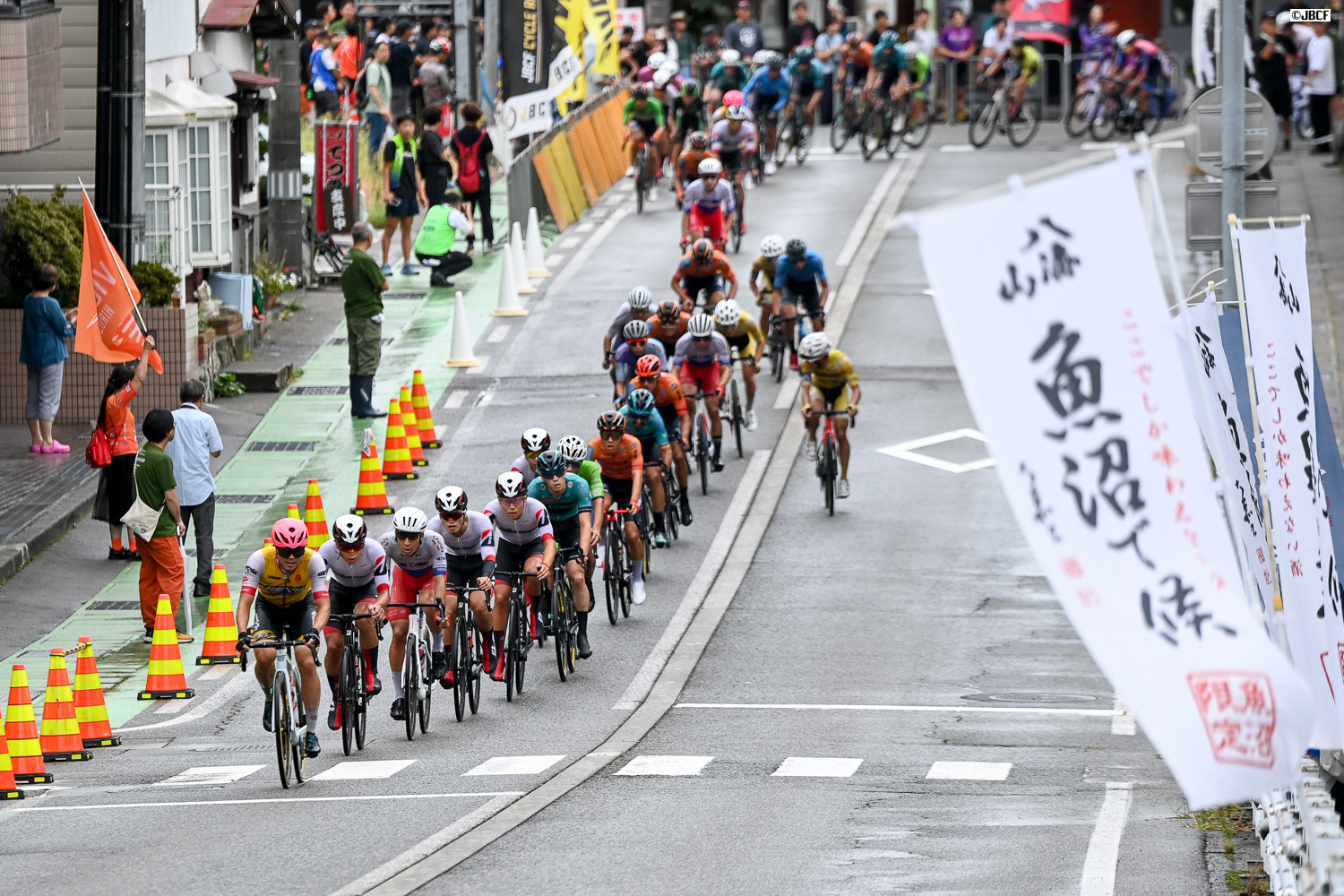 レース終盤、クリテリウムリーダージャージの孫崎大樹(ヴィクトワール広島)自ら集団先頭を牽引
