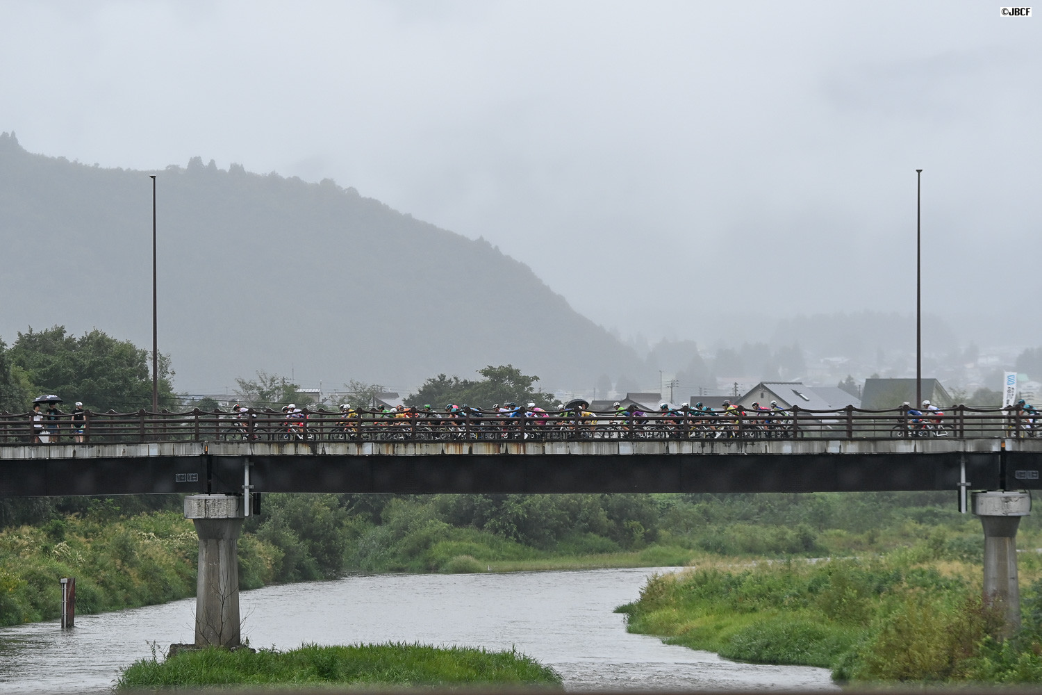 雨に煙る山を背景に魚野川を渡る集団