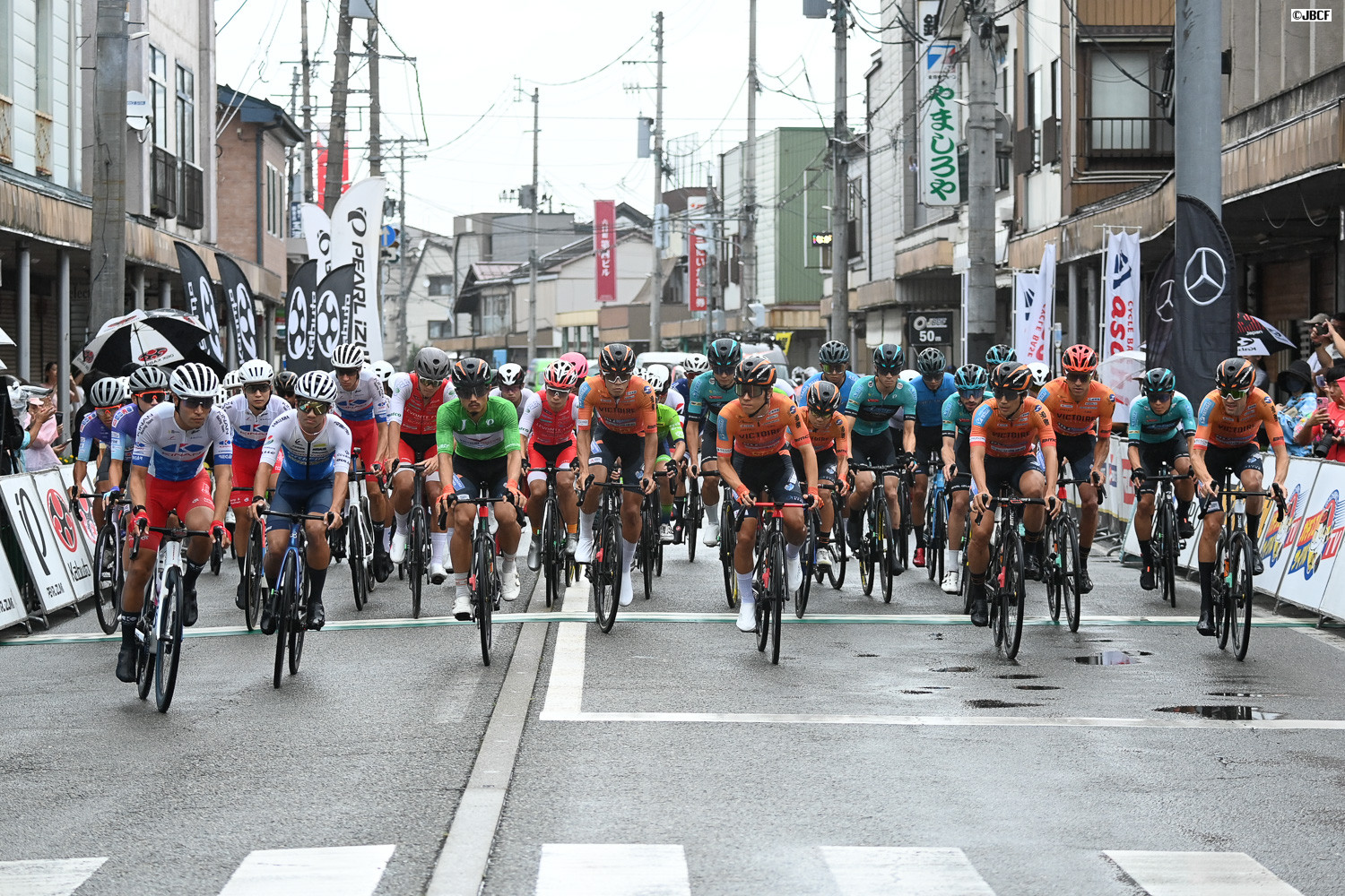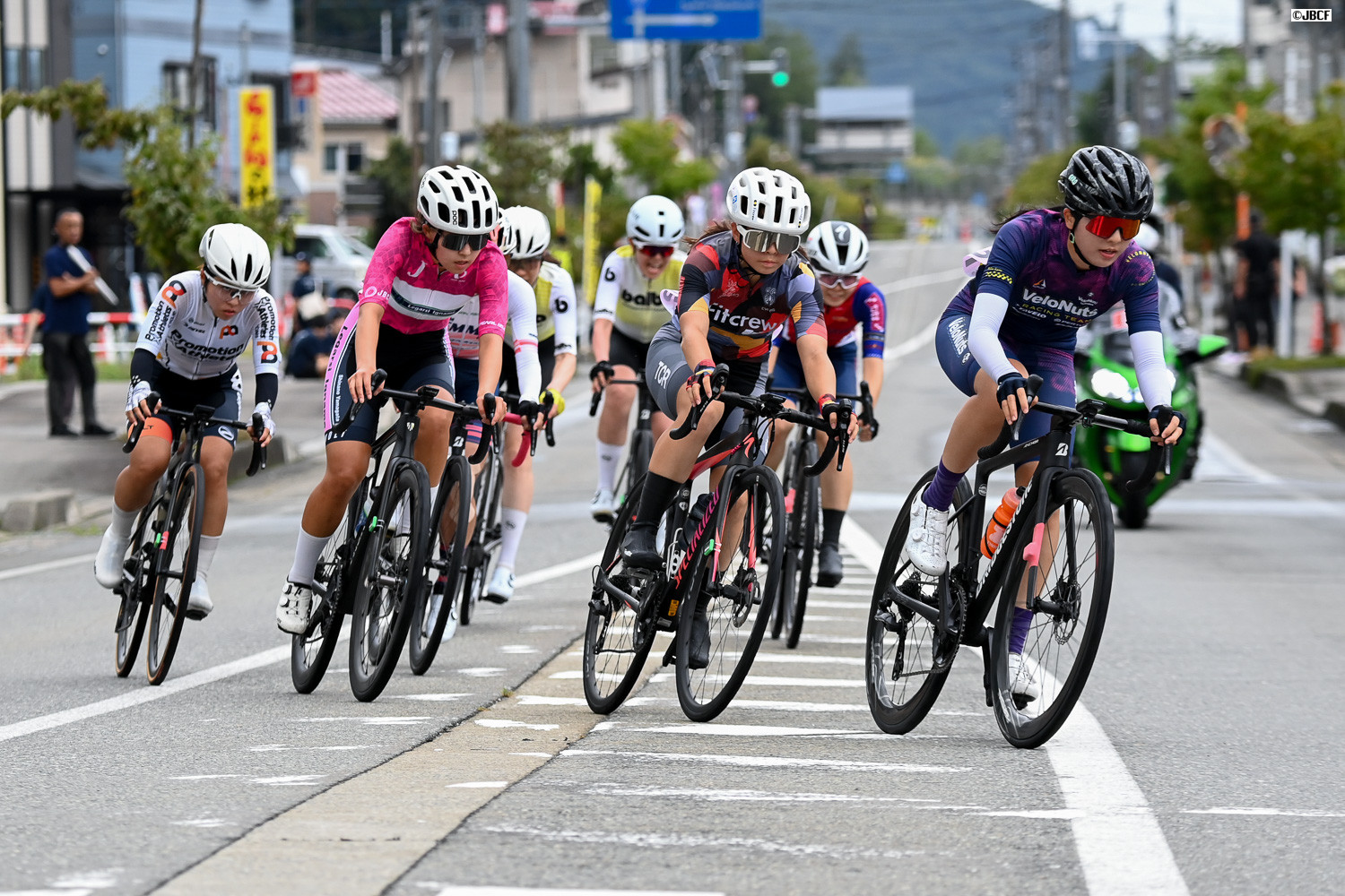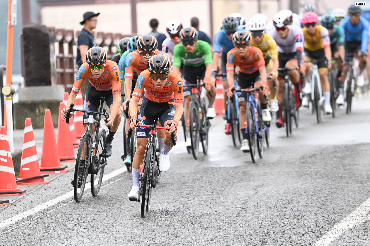 レース終盤、クリテリウムリーダージャージの孫崎大樹を従えてヴィクトワール広島がメイン集団を牽引する