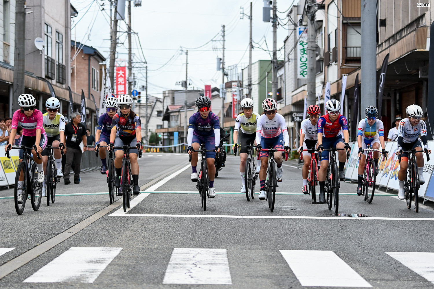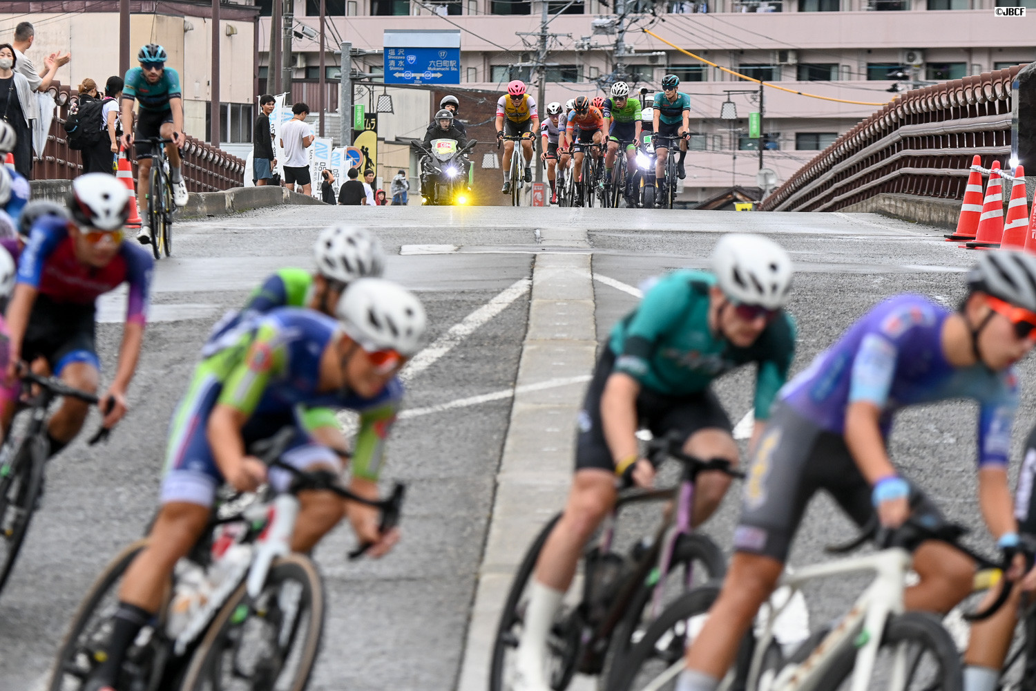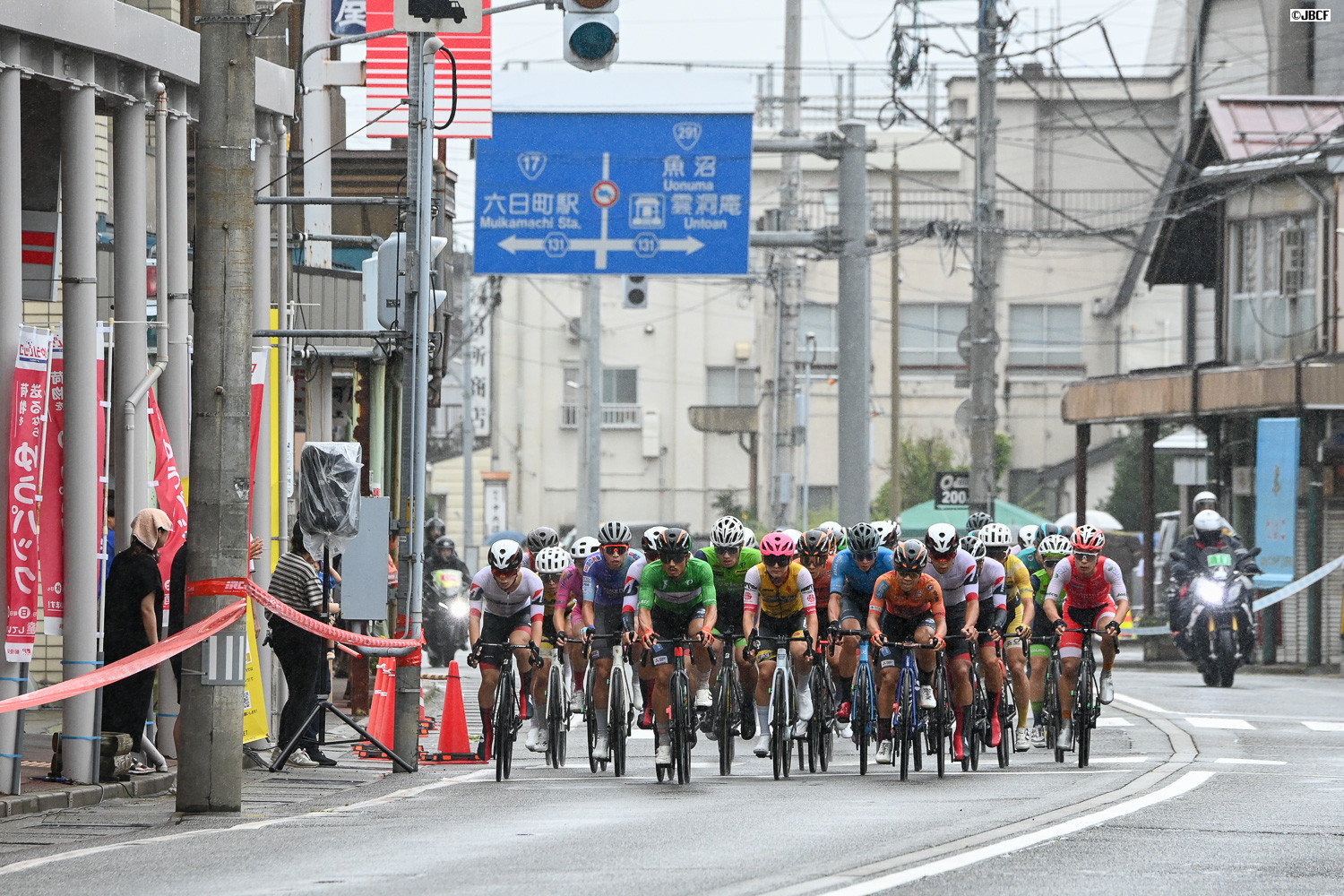 六日町商店街アーケードの先をハイスピードの集団が流れていく