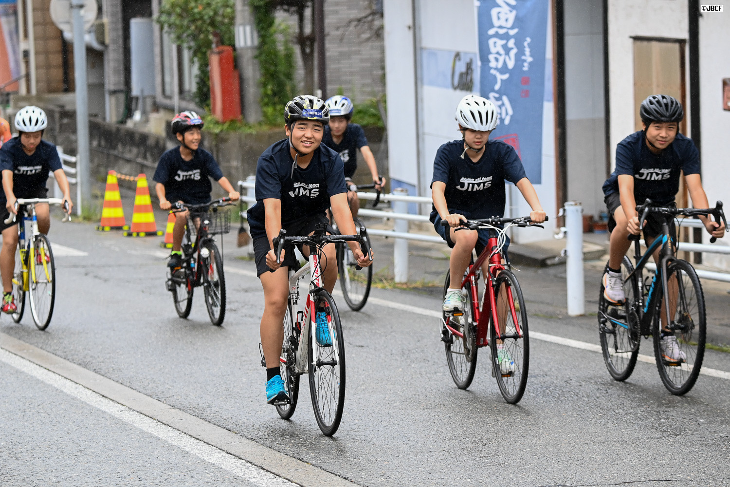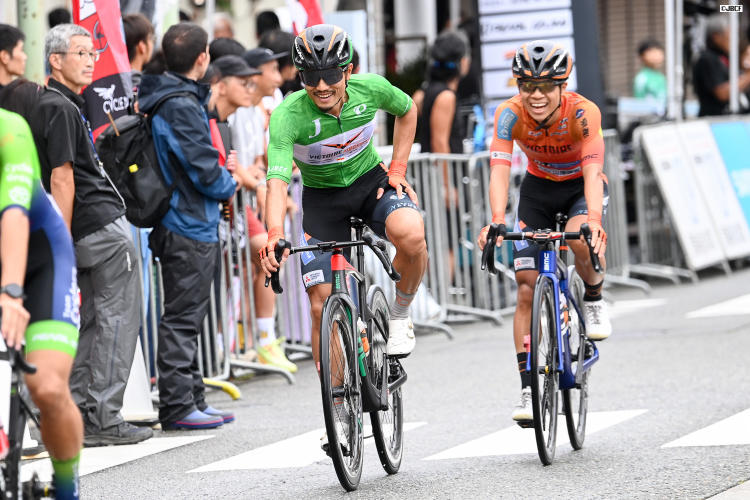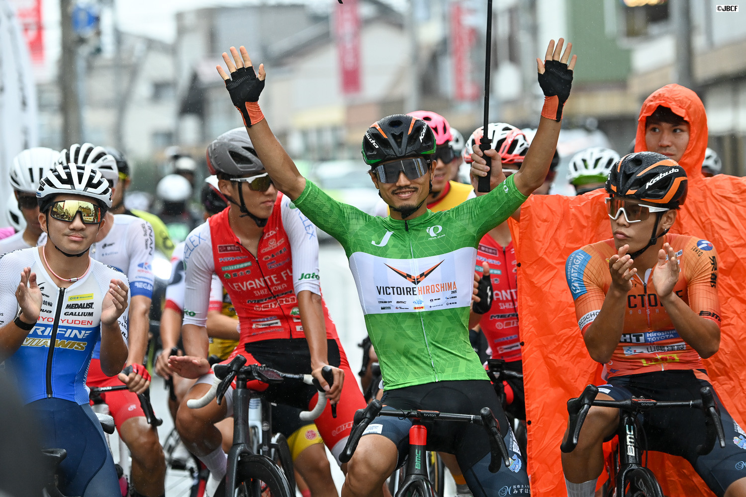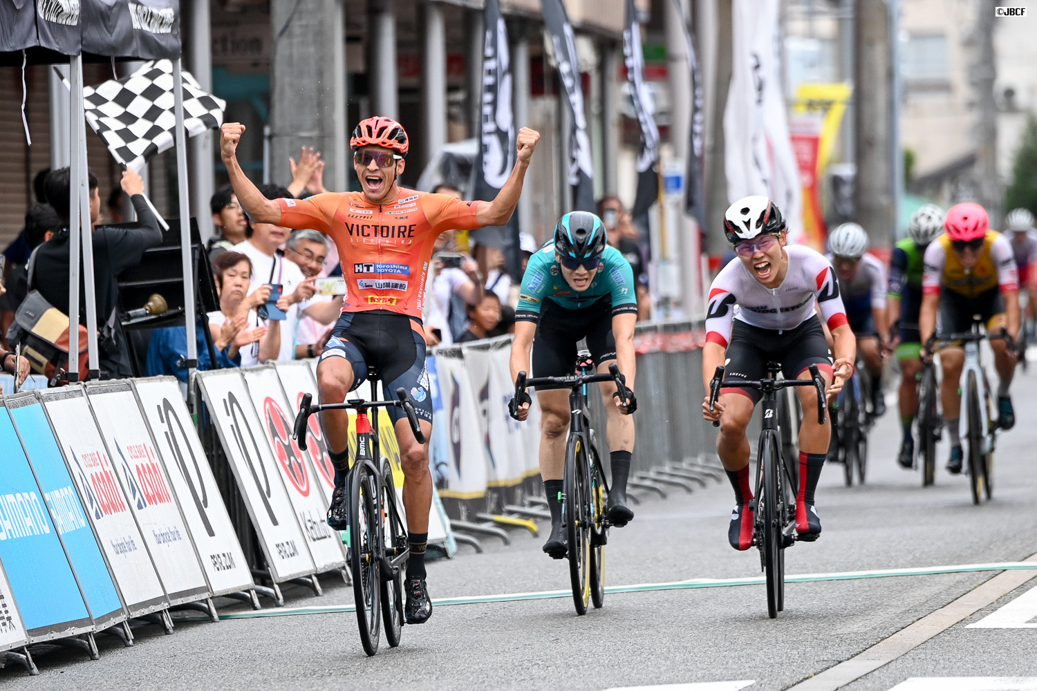 Jクリテリウムツアー総合優勝を決めた孫崎大樹(ヴィクトワール広島)がチームメイトと共にフィニッシュ