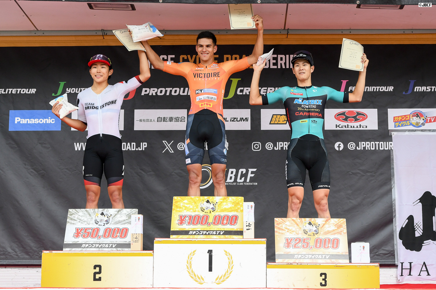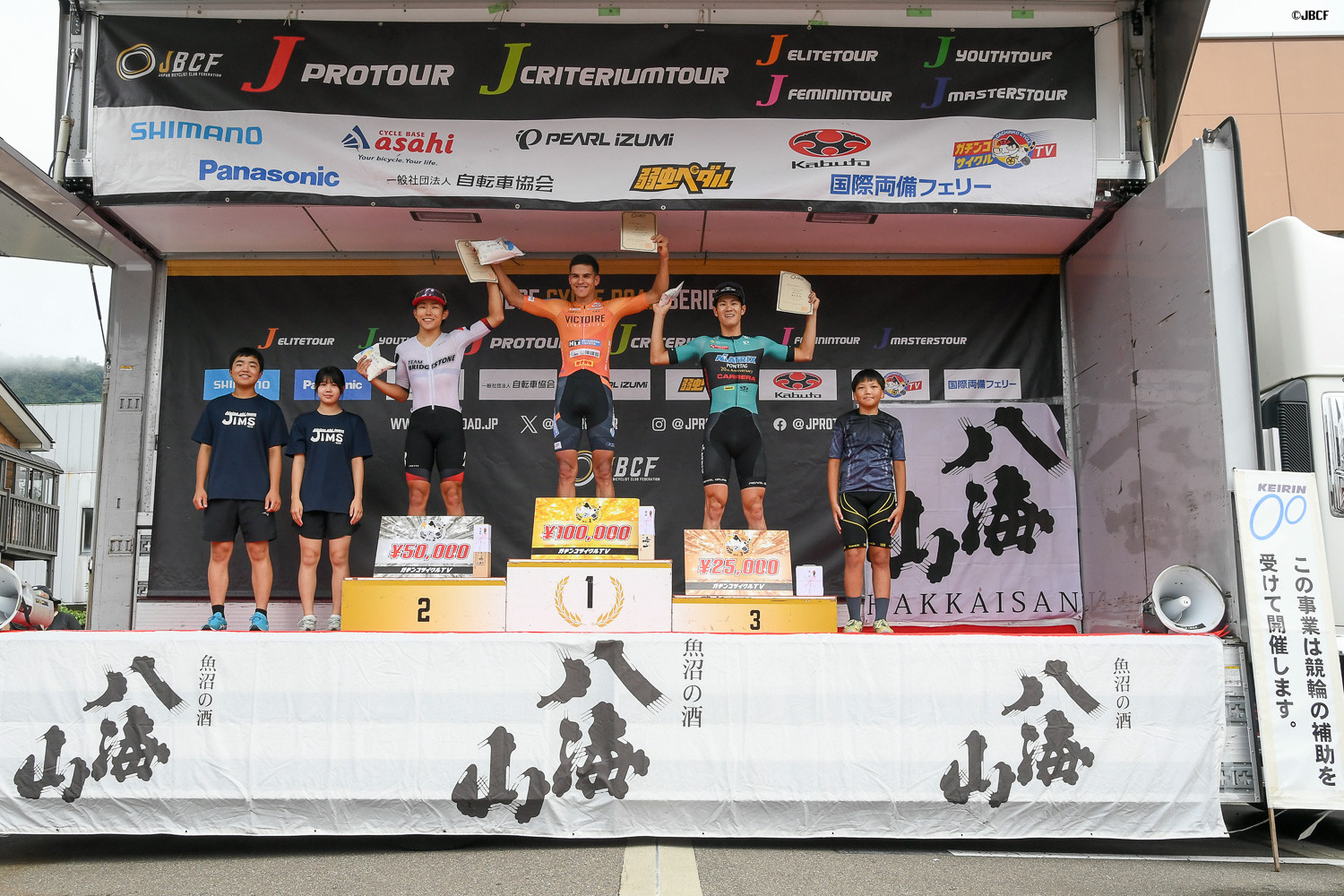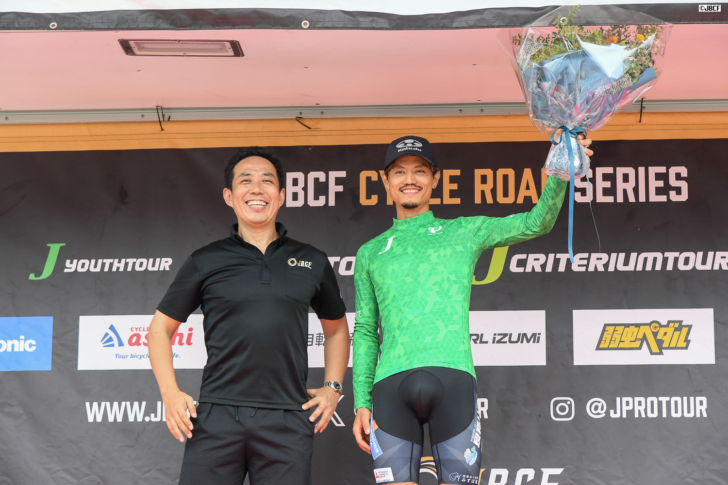 Jクリテリウムツアー総合優勝 孫崎大樹(ヴィクトワール広島)プレゼンターはJBCF加地理事長