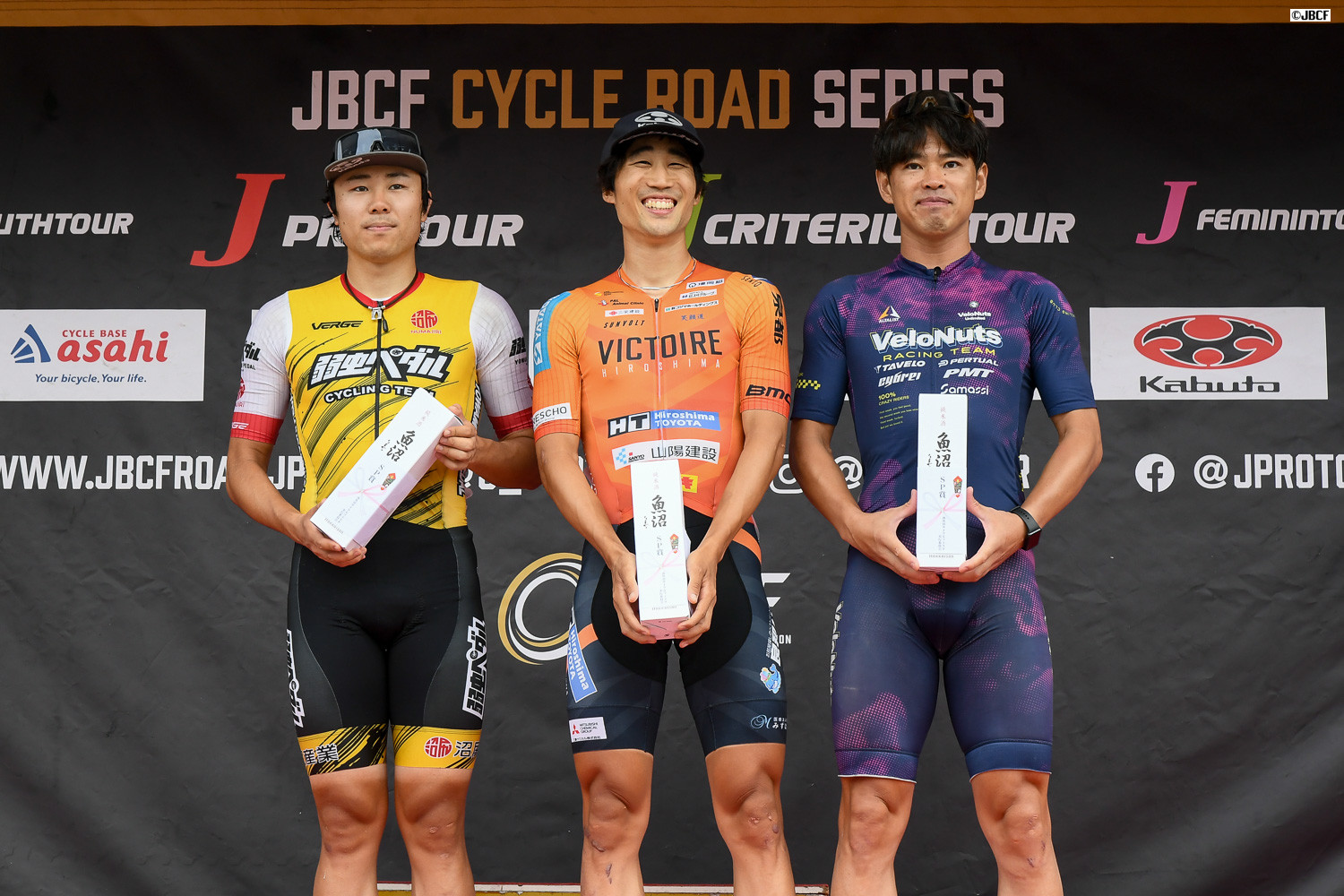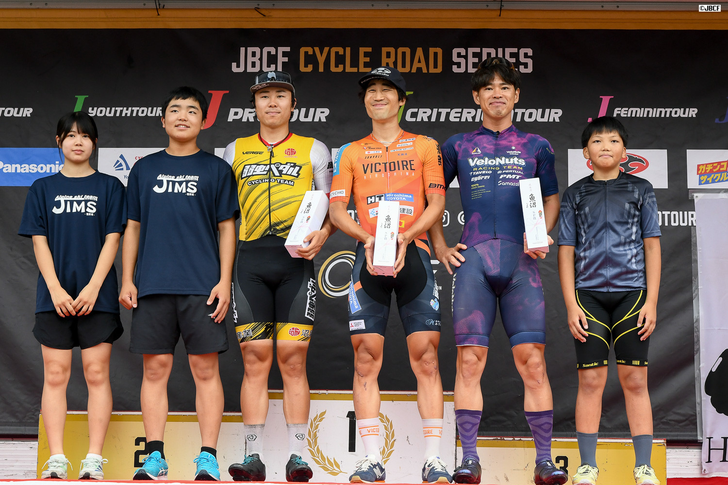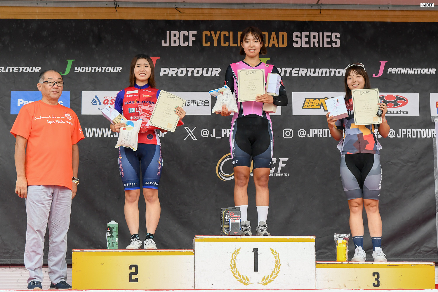 Jクリテリウムツアー総合優勝 孫崎大樹(ヴィクトワール広島)プレゼンターはJBCF加地理事長