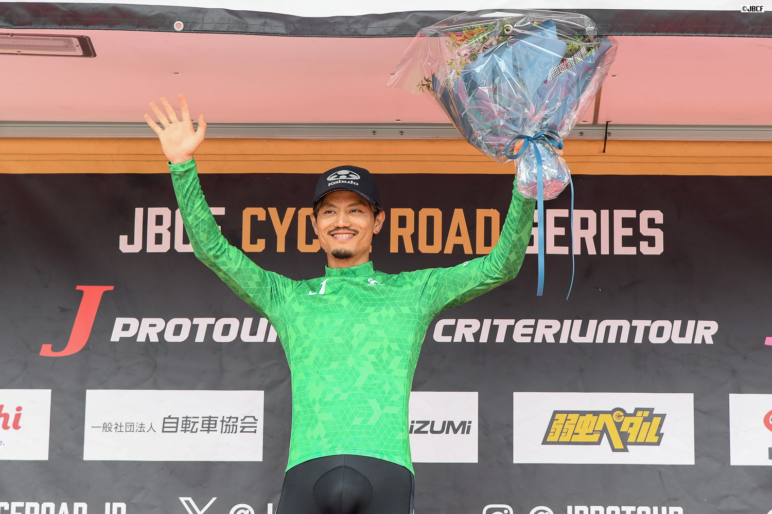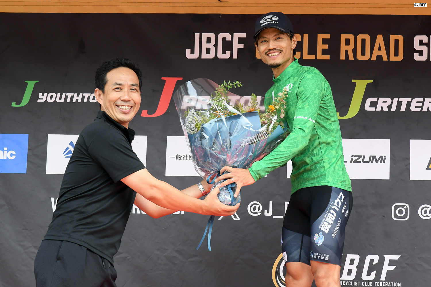 Jクリテリウムツアー総合優勝の孫崎大樹(ヴィクトワール広島)に、JBCFの加地理事長から花束の贈呈