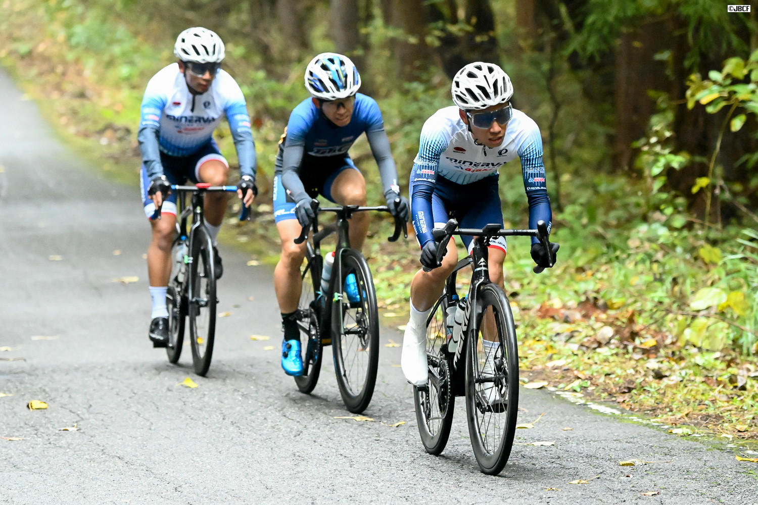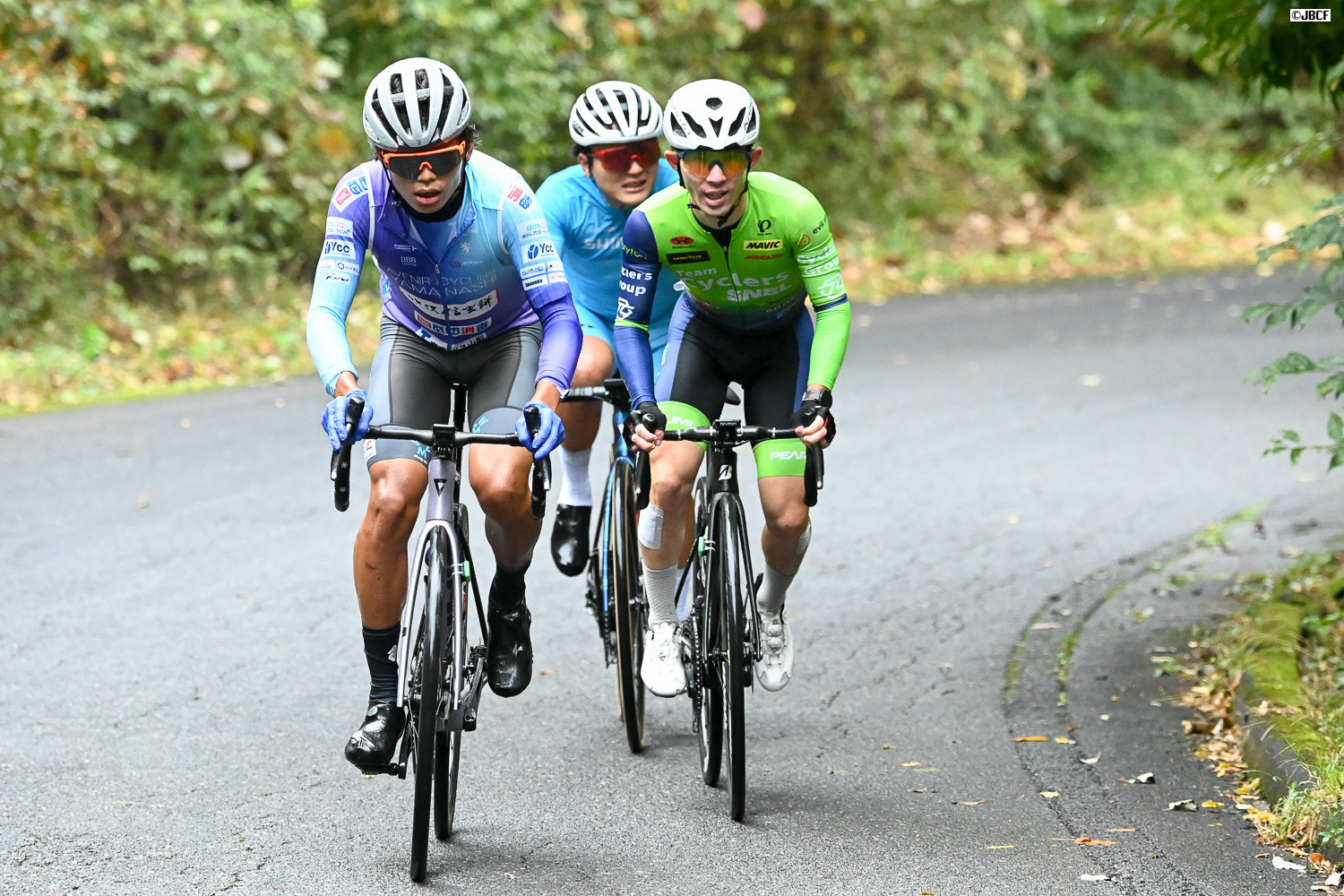 阿見寺俊哉(アヴニールサイクリング山梨)と佐藤光(TeamCyclersSNEL)がベンジャミン・ダイボール(ヴィクトワール広島)を追走