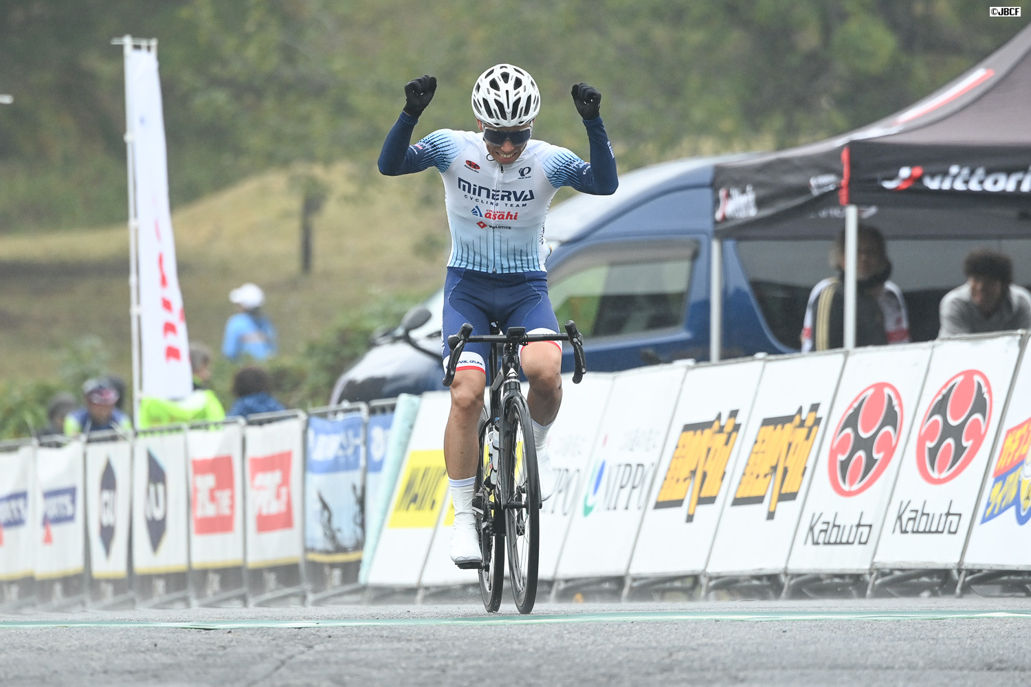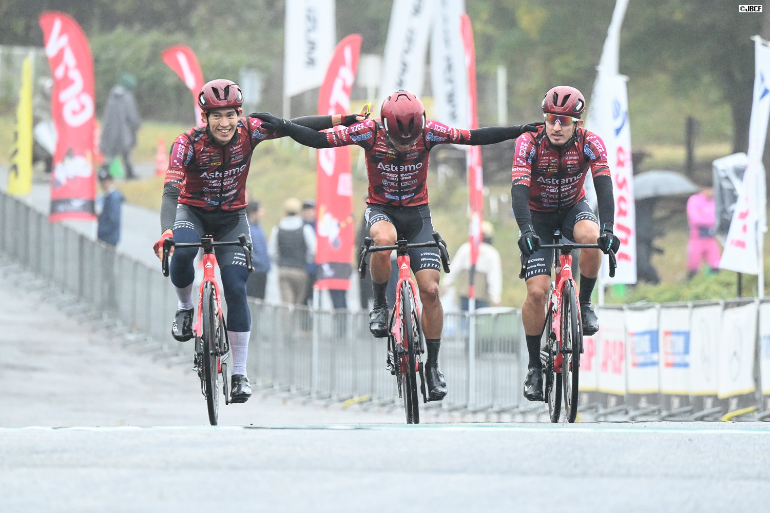 岡篤志の優勝を喜びながらフィニッシュする宇都宮ブリッツェンのメンバー