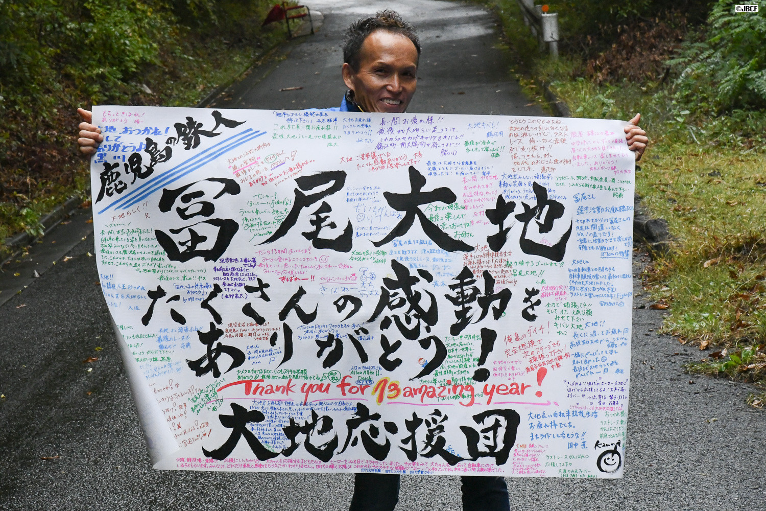 このレースで引退する冨尾大地の地元鹿児島から応援団が駆けつけた