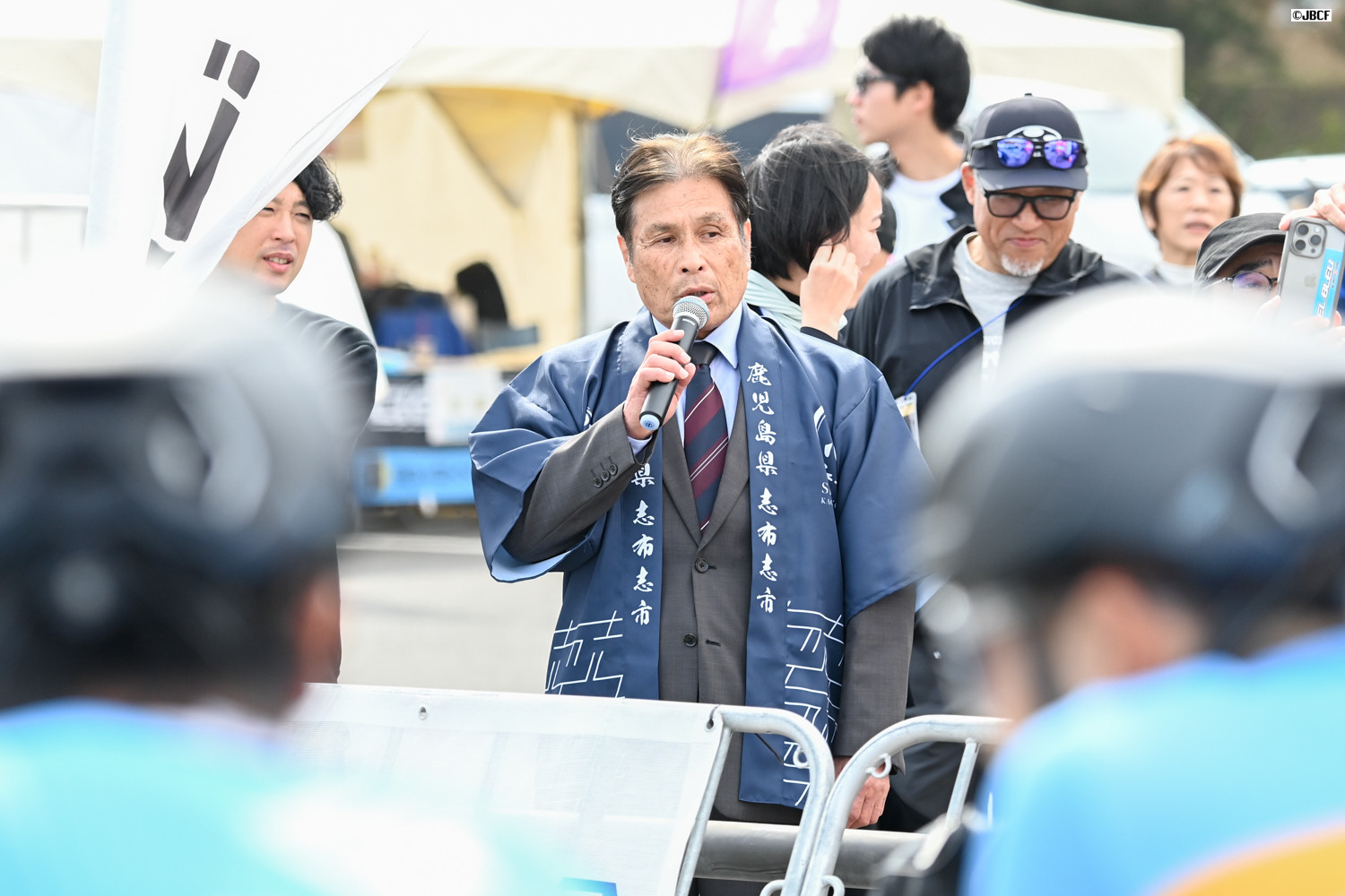 志布志市の溝口猛副市長がJクリテリウムツアーのスターターを務めた