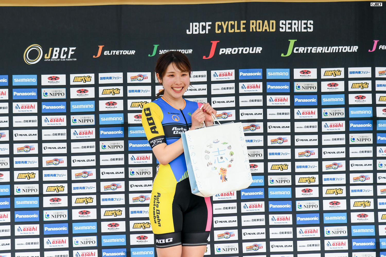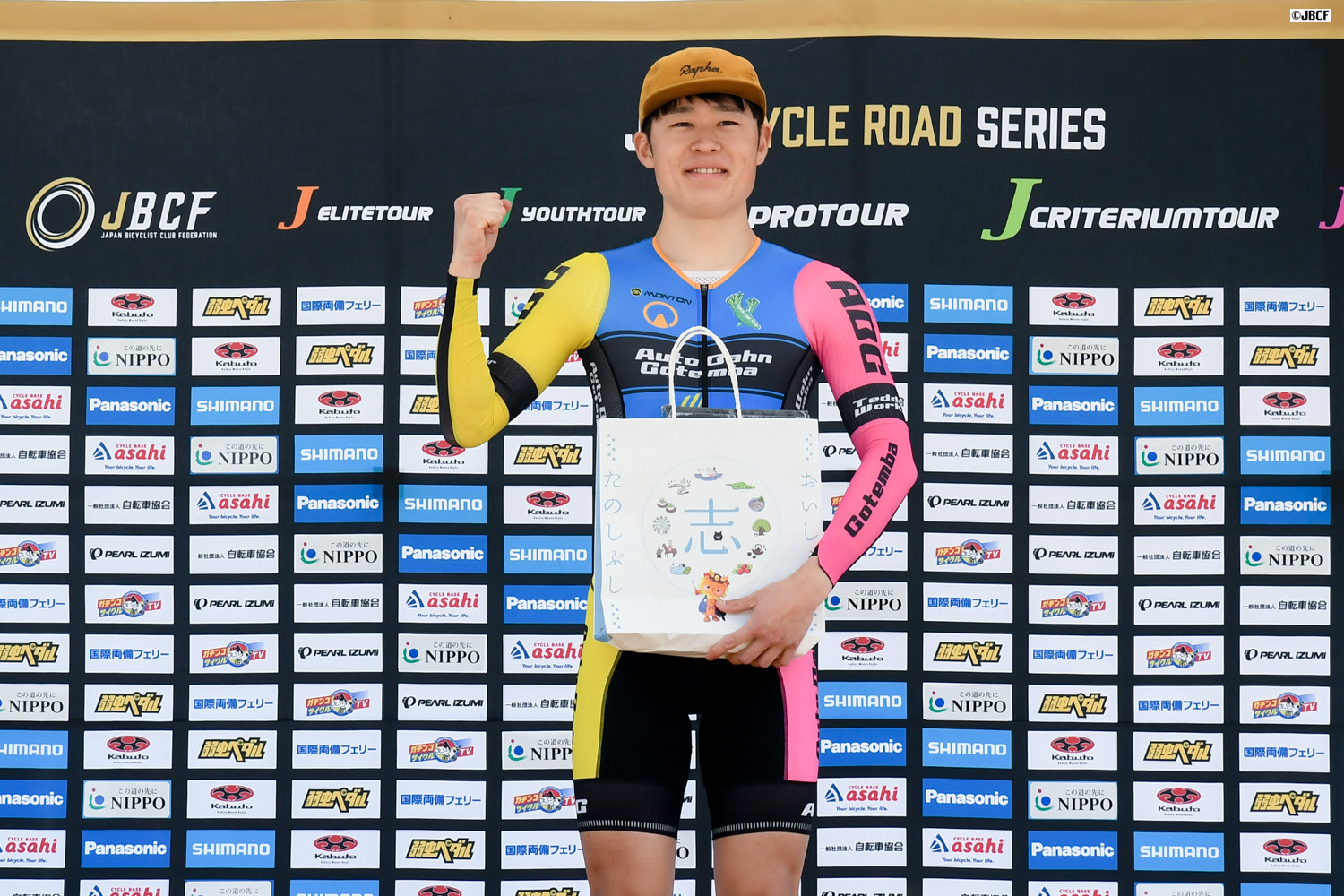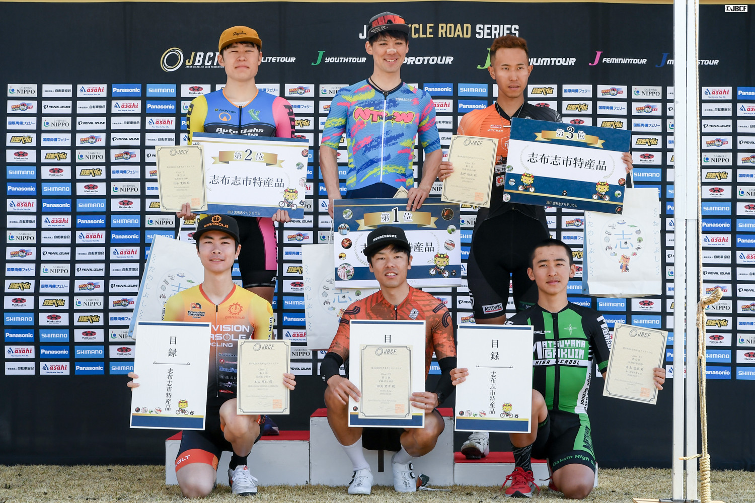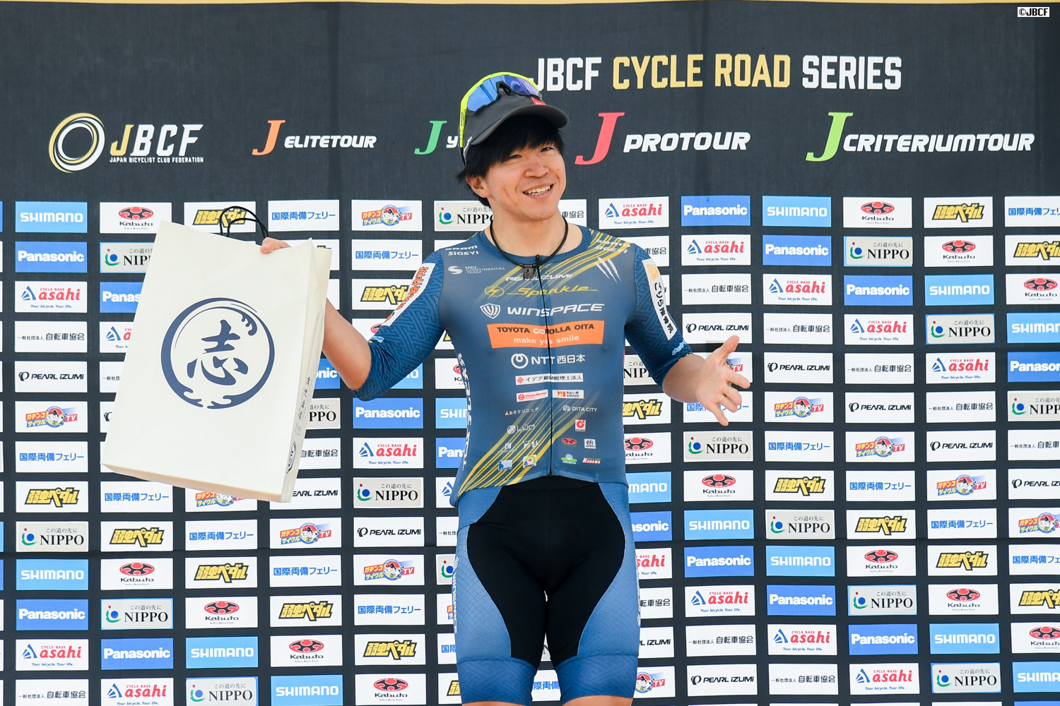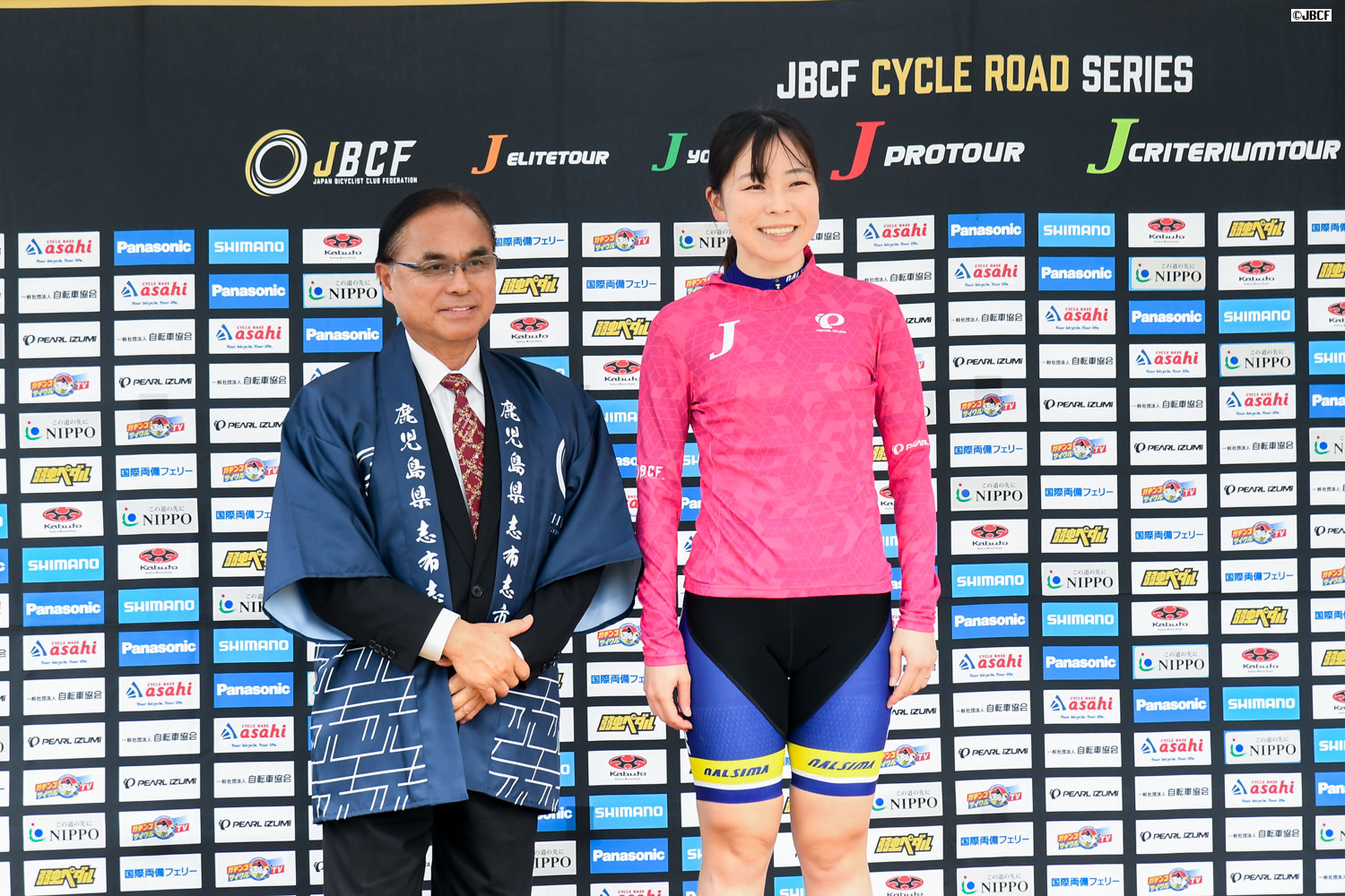 E1 U23リーダージャージは松木海斗(明星大学) プレゼンターは志布志市の溝口猛副市長