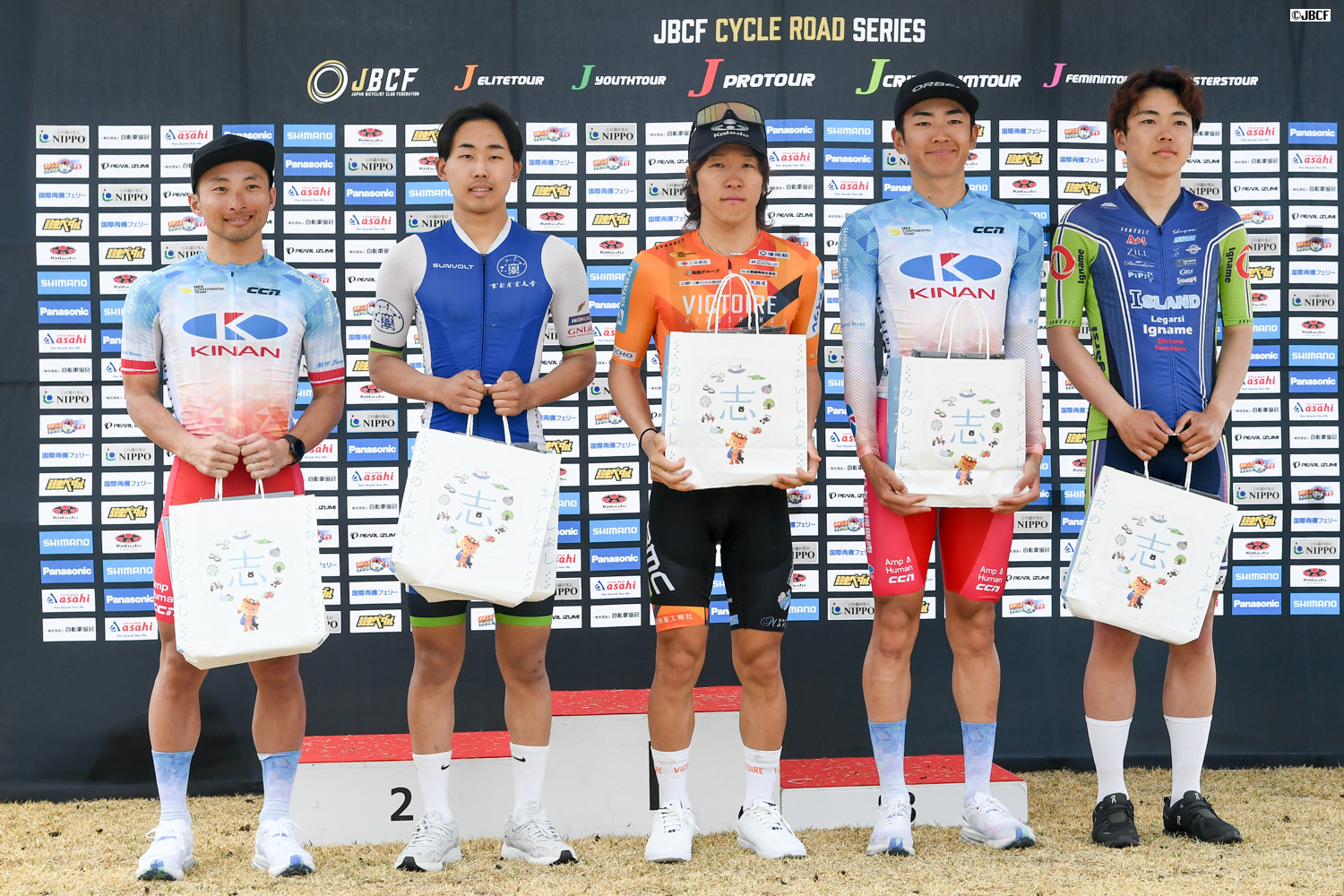 周回賞を獲得した選手。右から、山本元喜(KINAN Racing Team)、渡辺一気(京都産業大学)、中村圭佑(ヴィクトワール広島)、橋川丈(KINAN Racing Team)、大山航平(イナーメ信濃山形)
