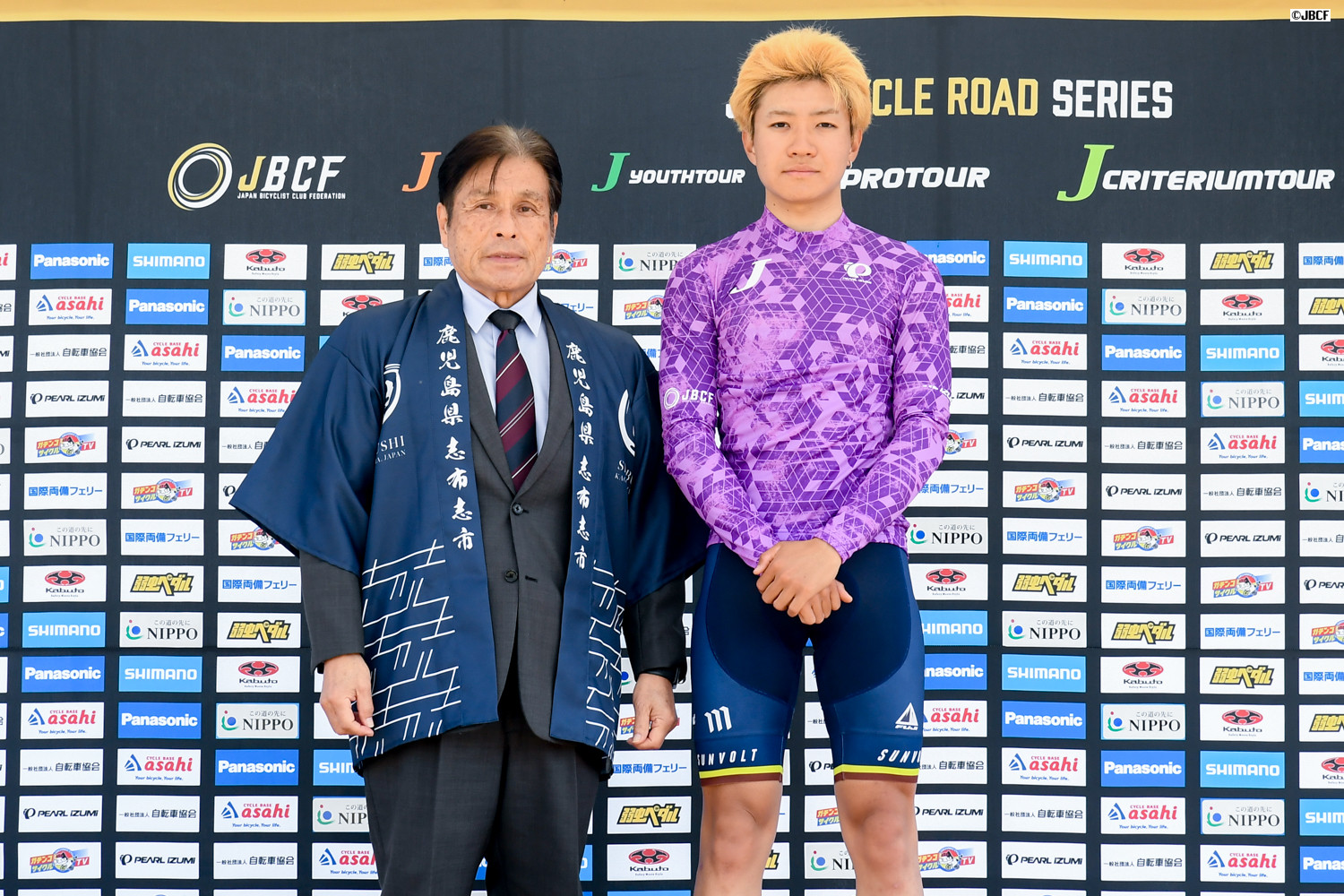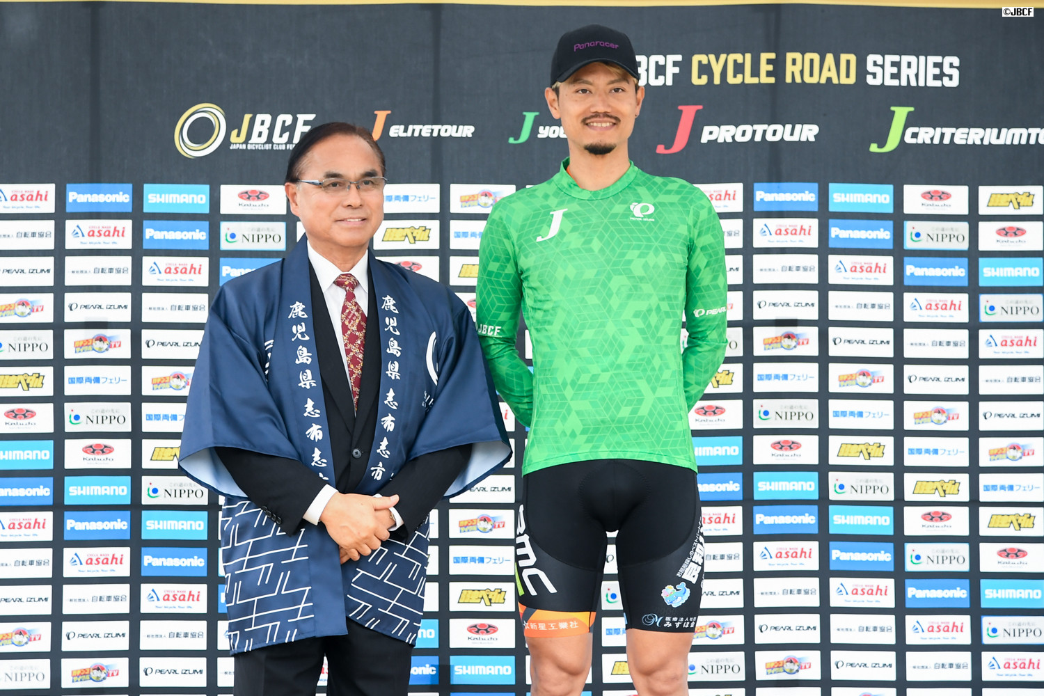 クリテリウムリーダージャージは孫崎大樹(ヴィクトワール広島)プレゼンターは志布志市の下平晴行市長