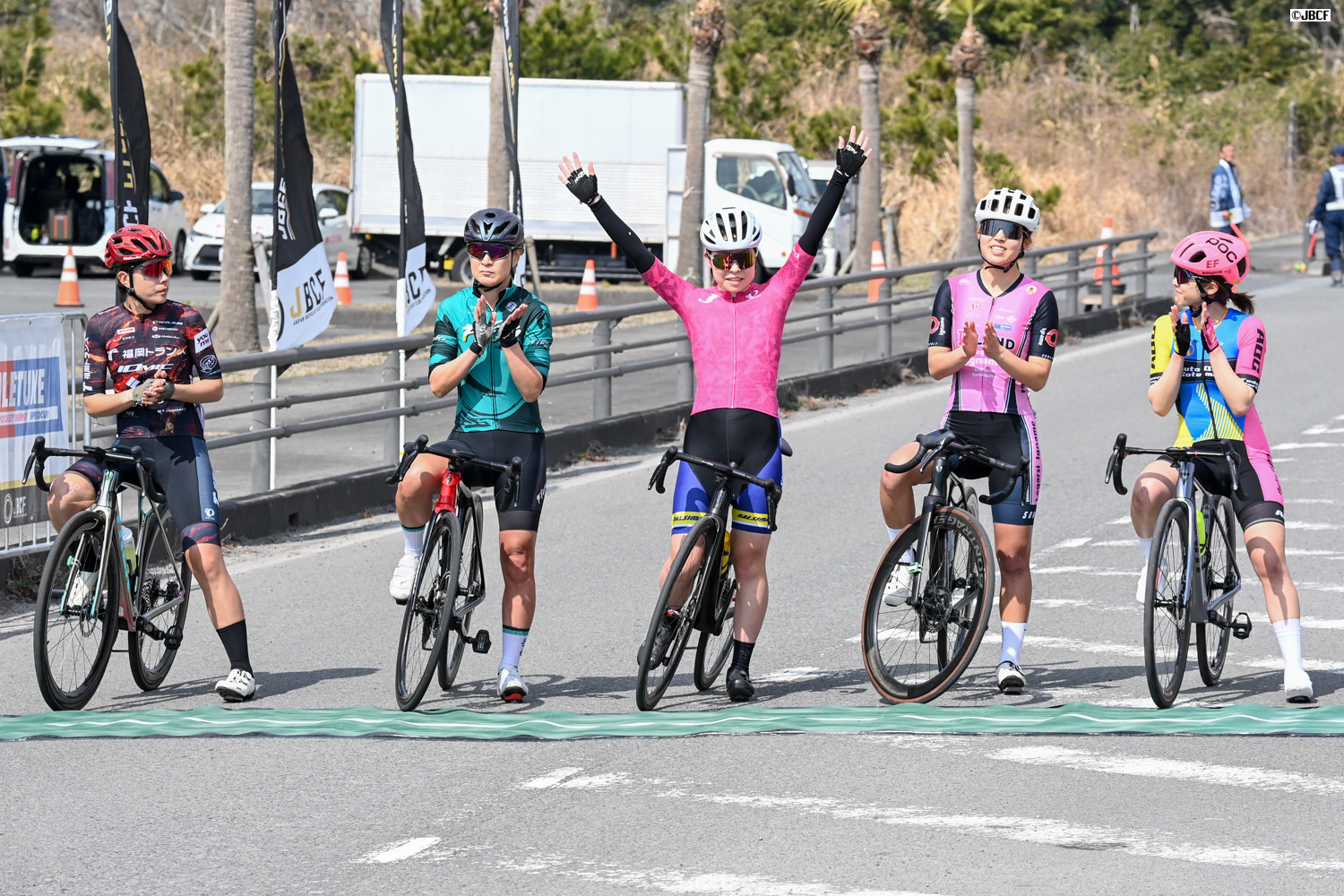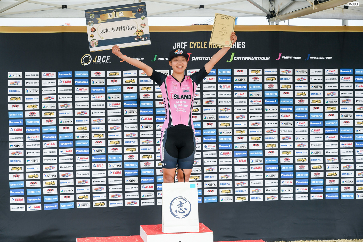 F フェミニンリーダージャージは林優希 (なるしまフレンドレーシングチーム)が維持。プレゼンターは志布志市の下平晴行市長