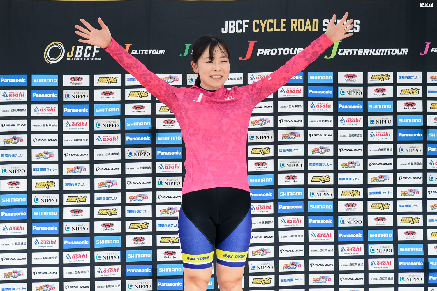 F スタートラインで選手紹介に応えるリーダージャージの林優希 (なるしまフレンドレーシングチーム)