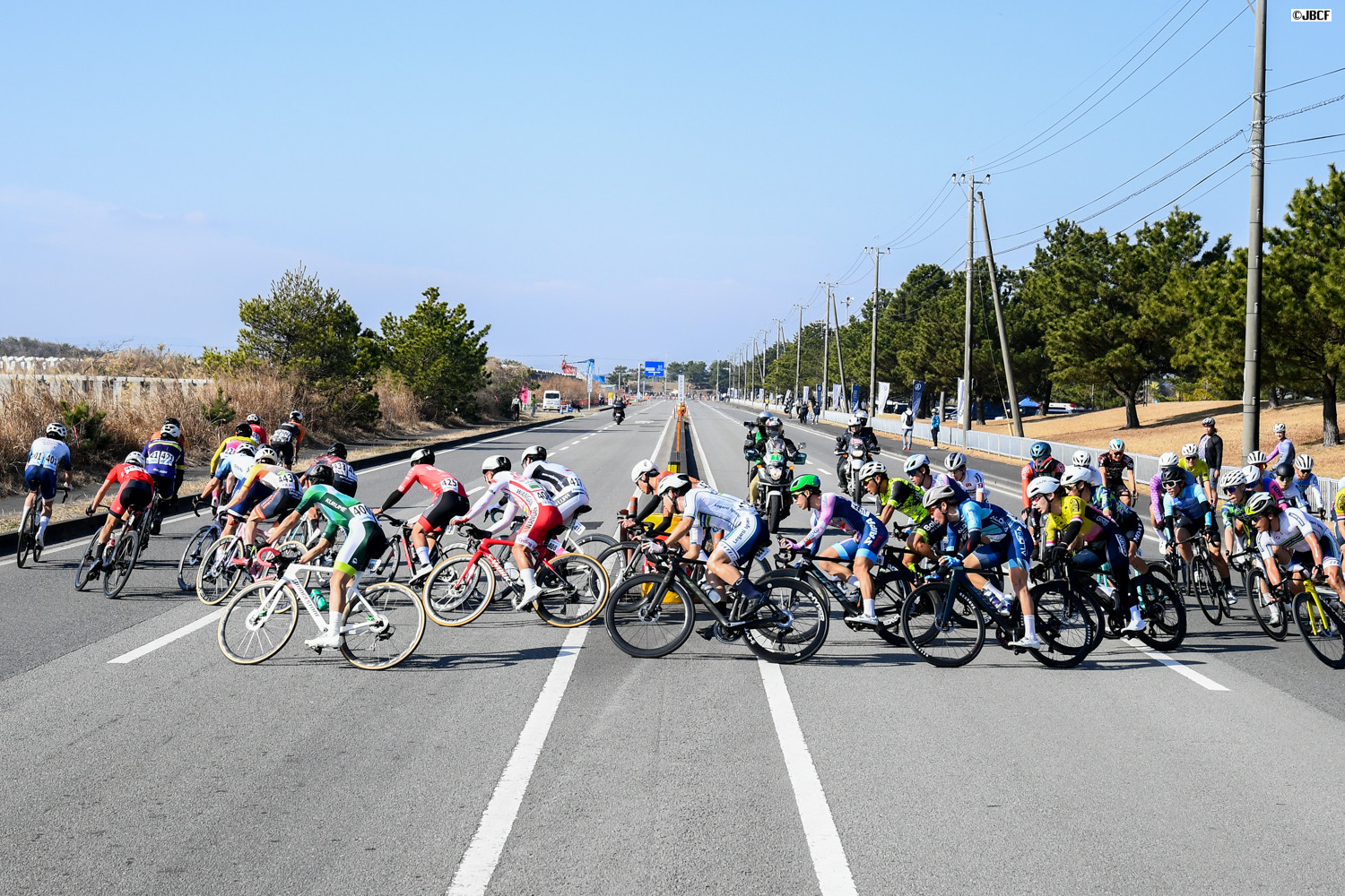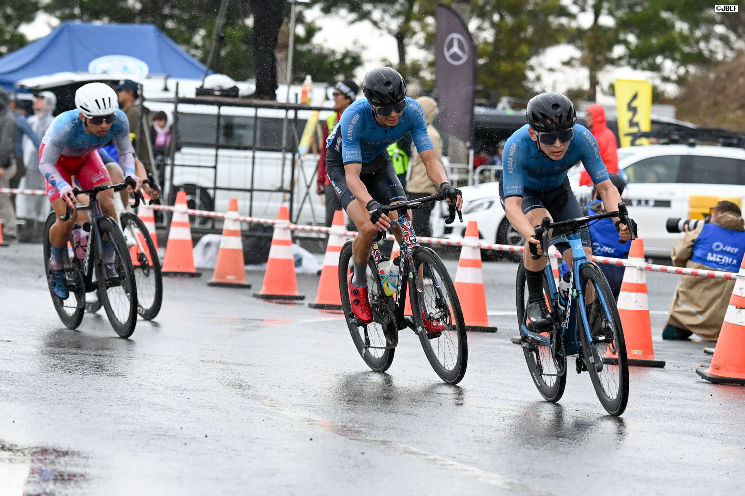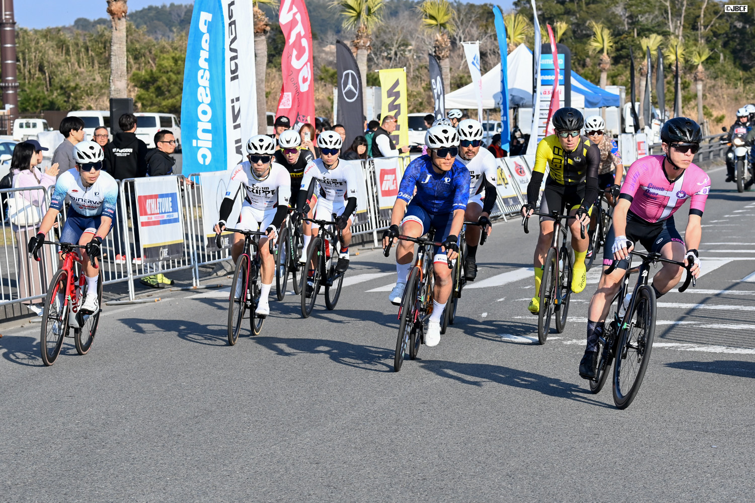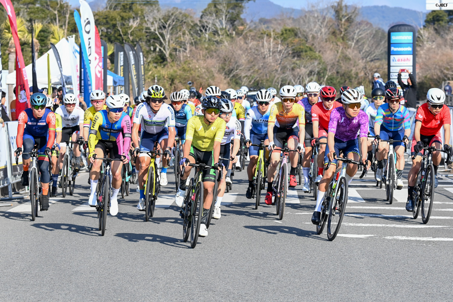 E1 エリートリーダージャージの井上悠喜(松山学院高等学校)、U23リーダージャージの松木海斗(明星大学)を先頭にパレードスタート