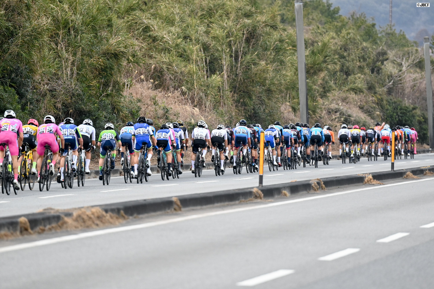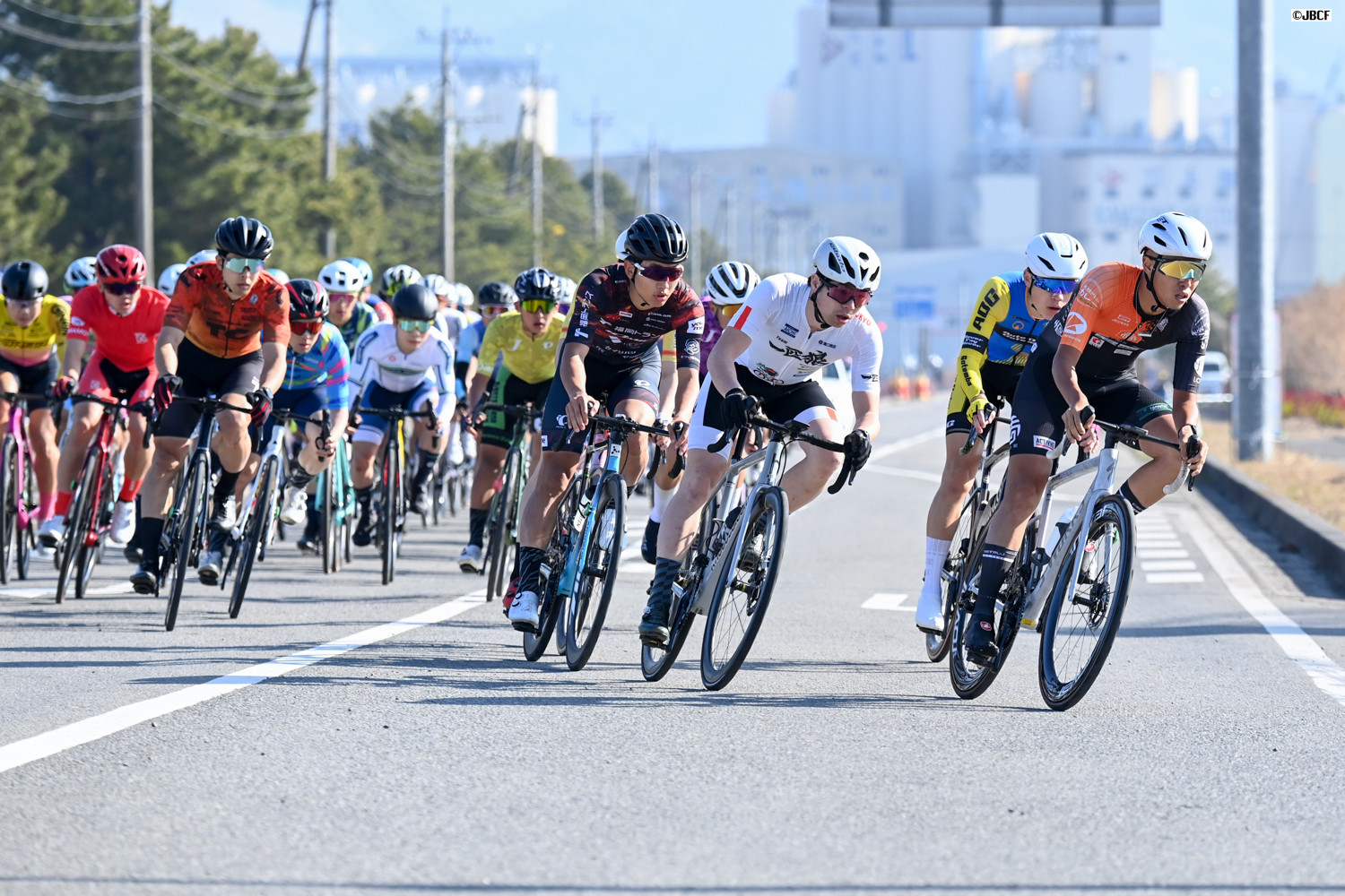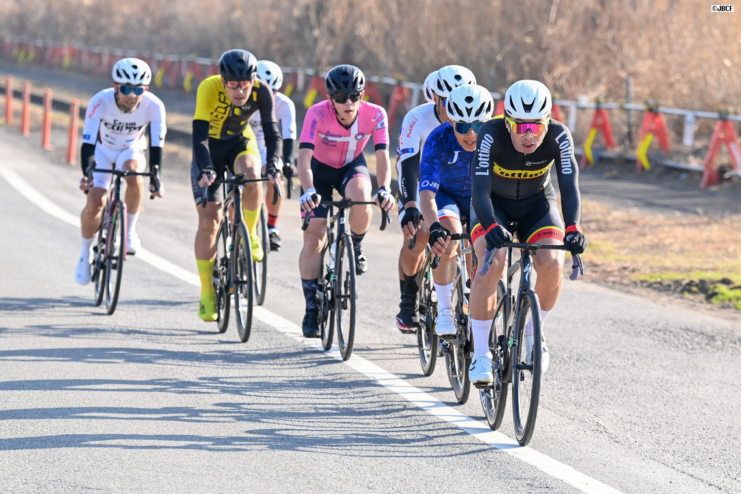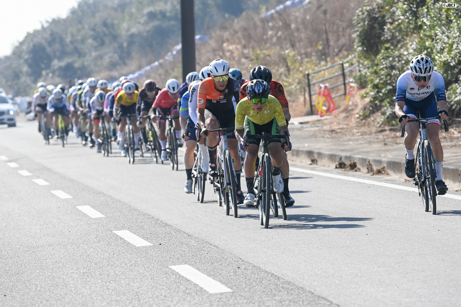 E1 集団中ほどに位置取るU23リーダージャージの松木海斗(明星大学)