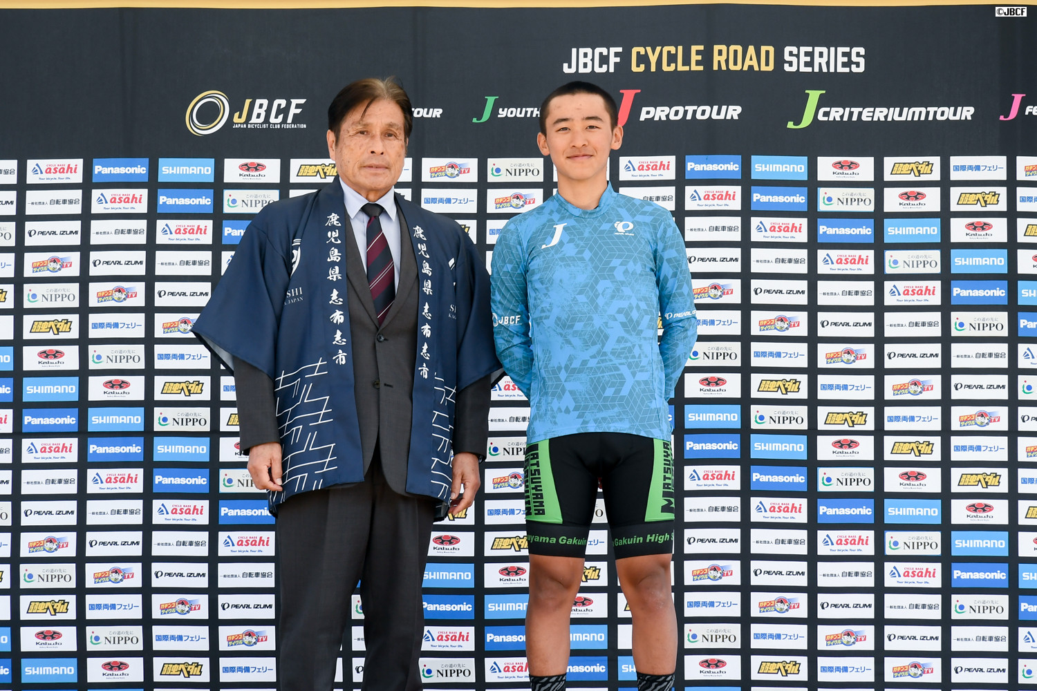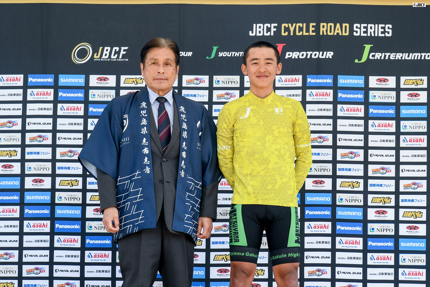 E1 U-19リーダージャージは井上悠喜(松山学院高等学校)プレゼンターは志布志市の溝口猛副市長