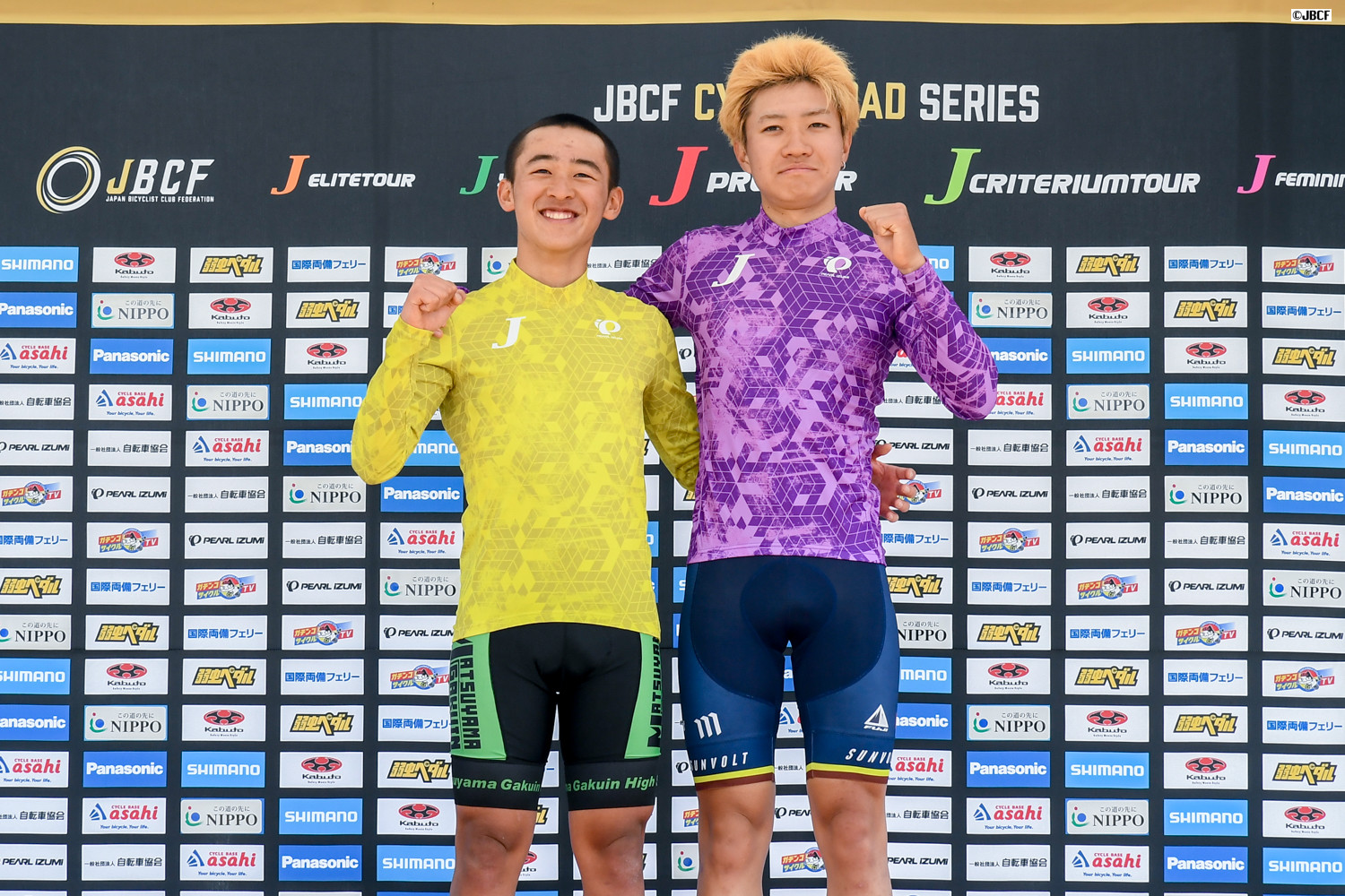 E1 エリートリーダージャージの井上悠喜(松山学院高等学校、左)と、U23リーダージャージの松木海斗(明星大学)