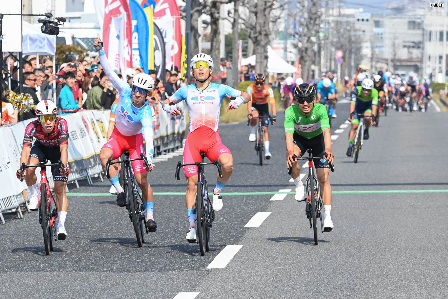 優勝した草場啓吾とアシストした新城雄大(KINAN Racing Team)が喜ぶ