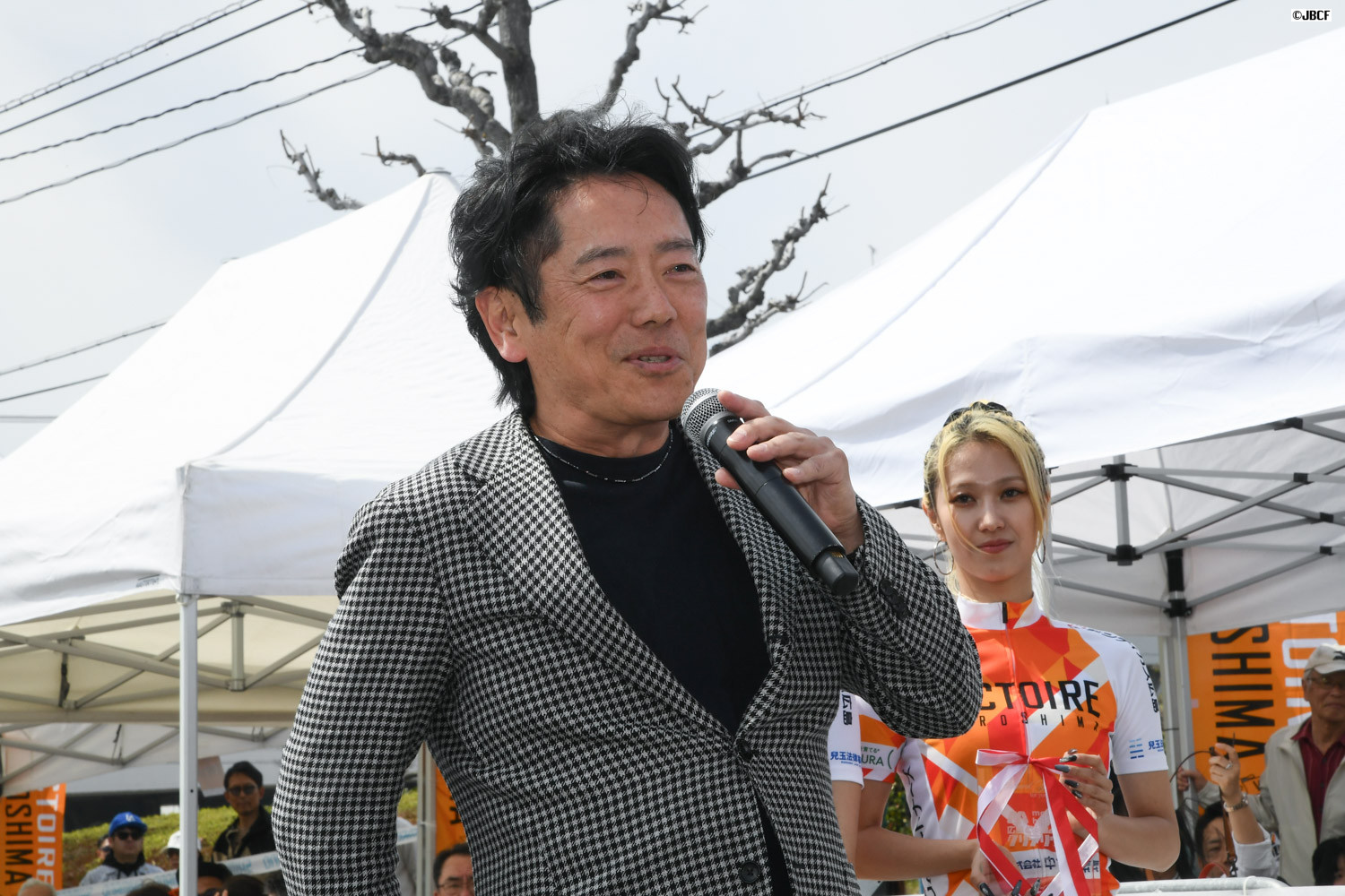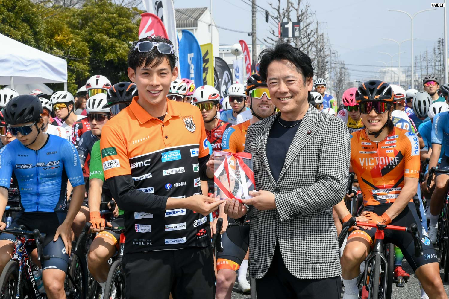 クリテリウムリーダージャージは草場啓吾(KINAN Racing Team)プレゼンターは株式会社マリモホールディングス代表取締役社長の深川真様