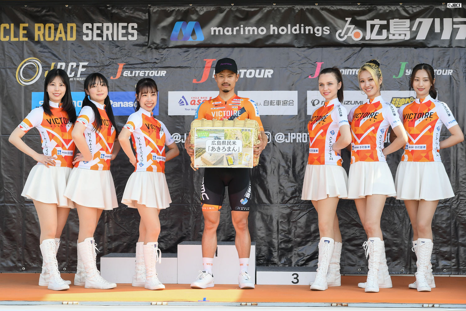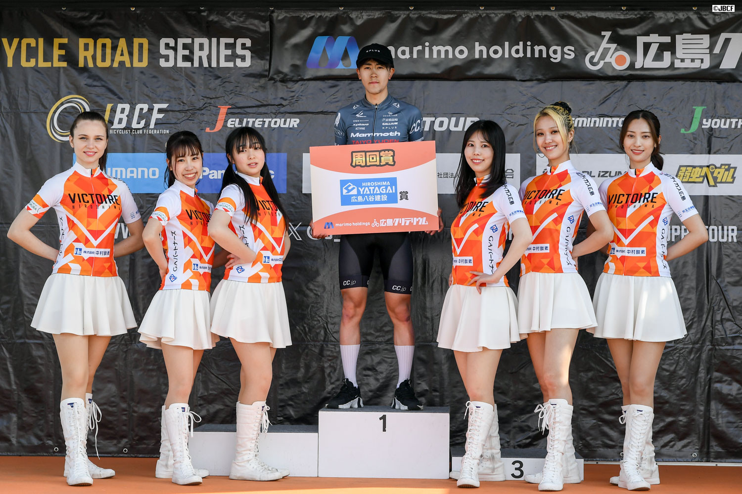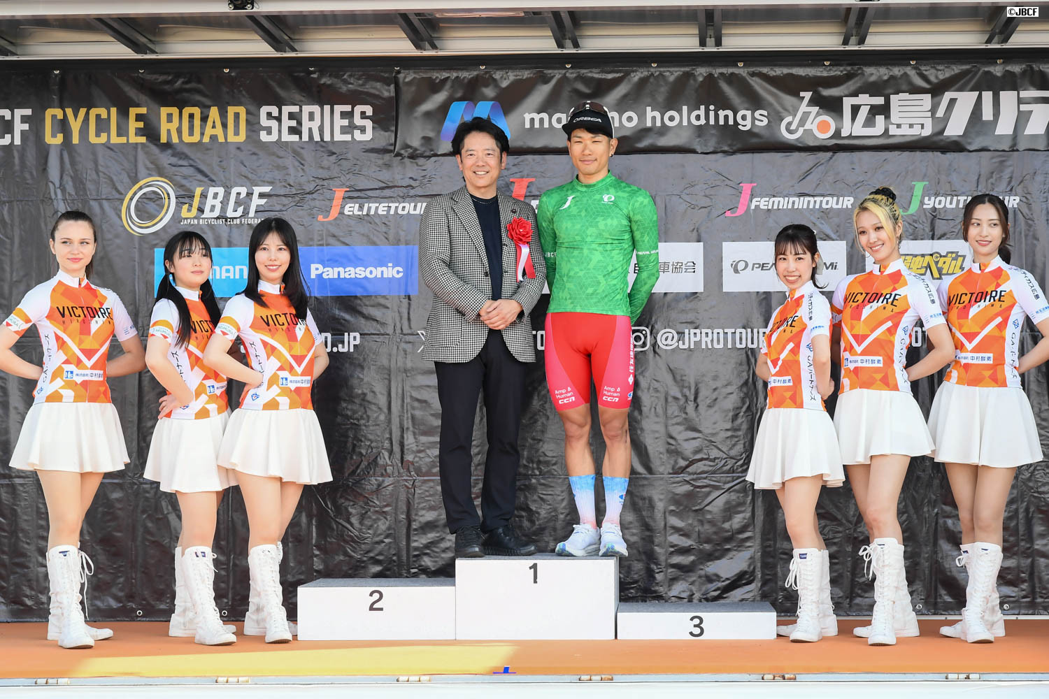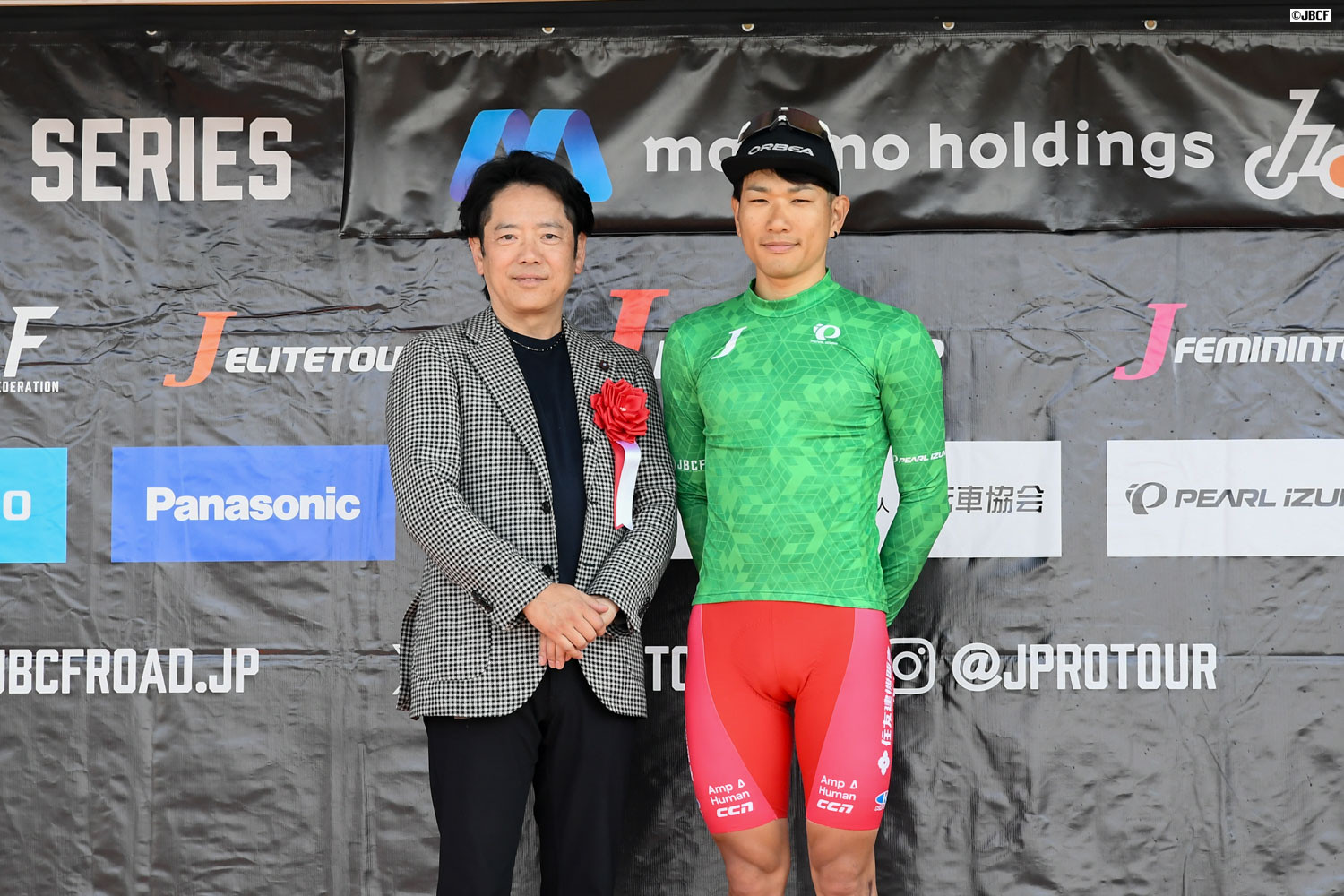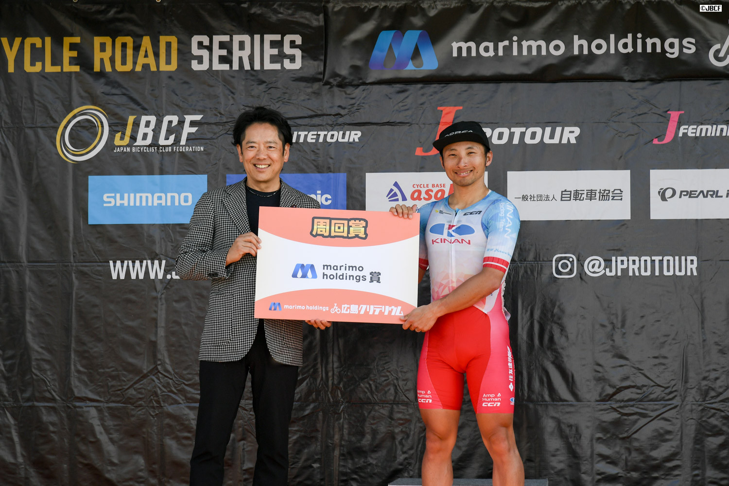 クリテリウムリーダージャージは草場啓吾(KINAN Racing Team)が獲得。プレゼンターは株式会社マリモホールディングス代表取締役社長の深川真様とアビガール