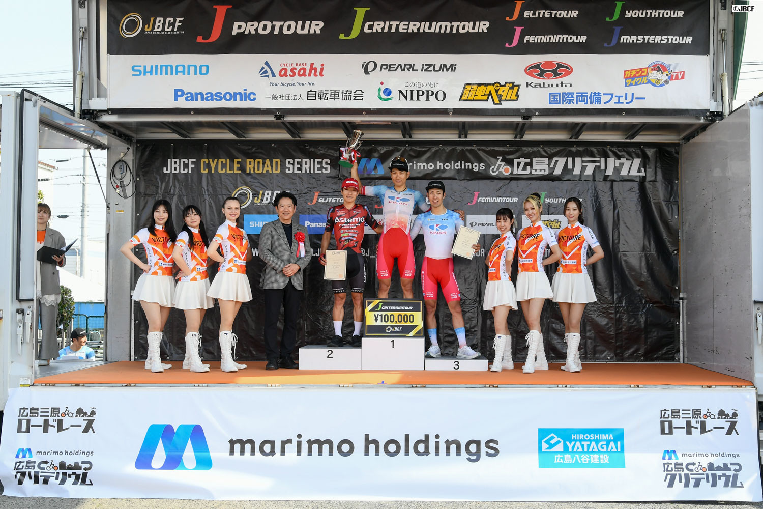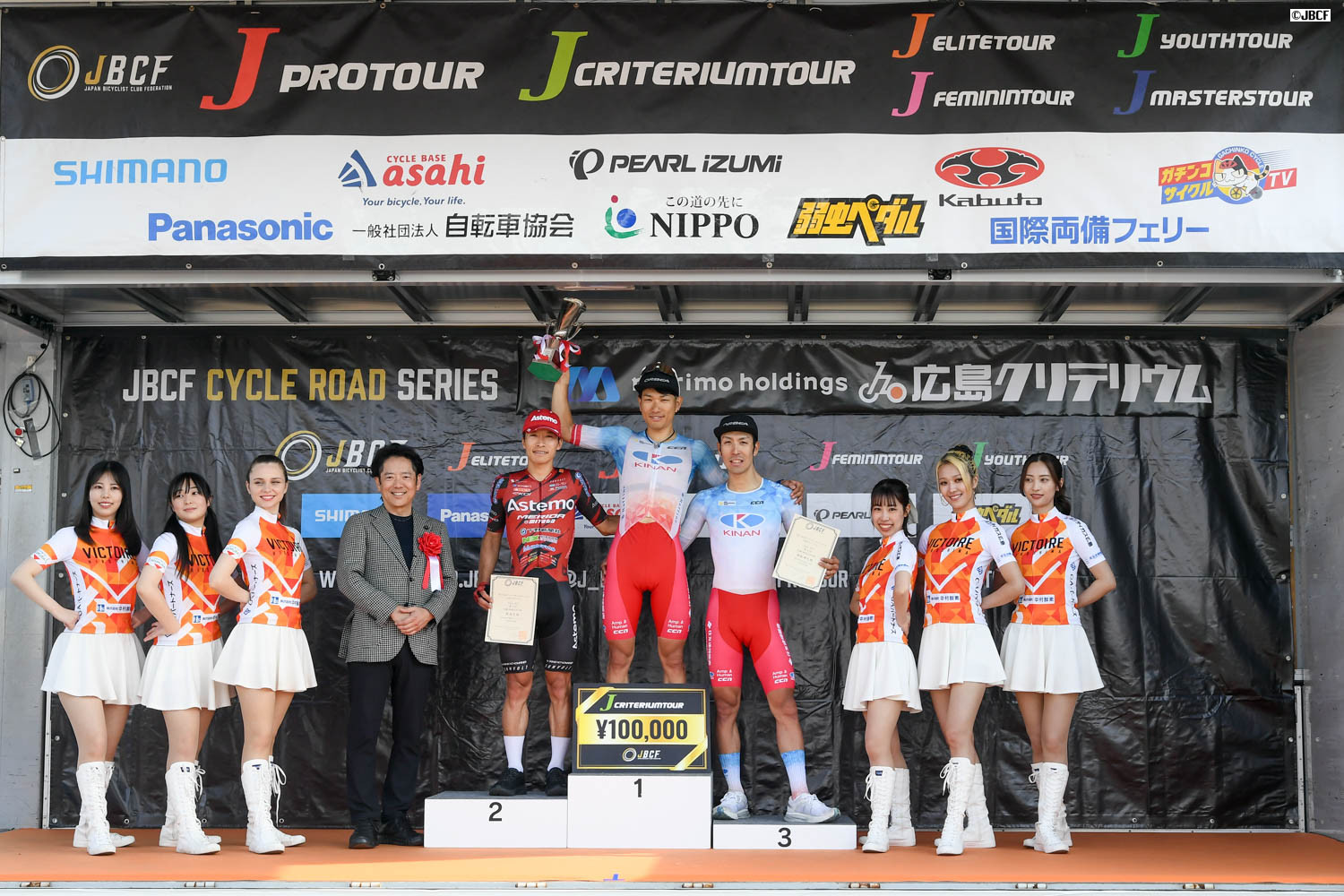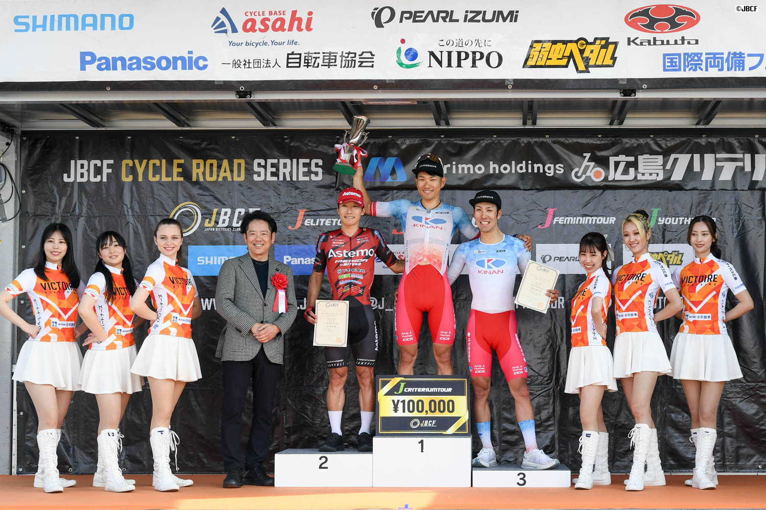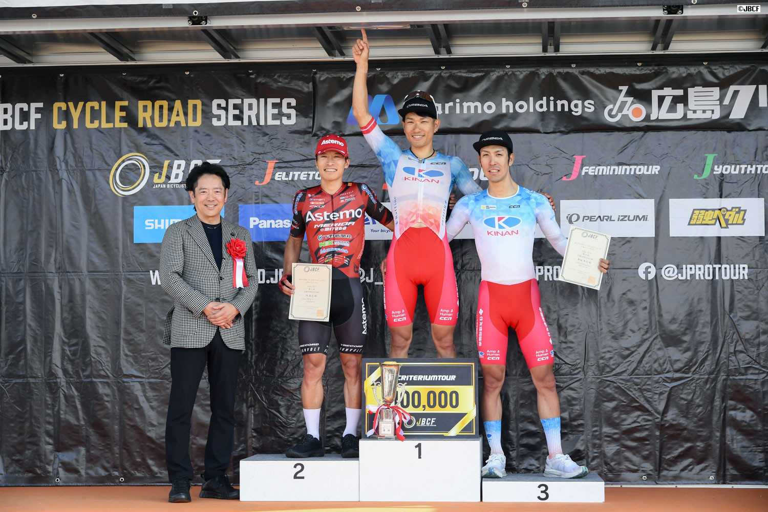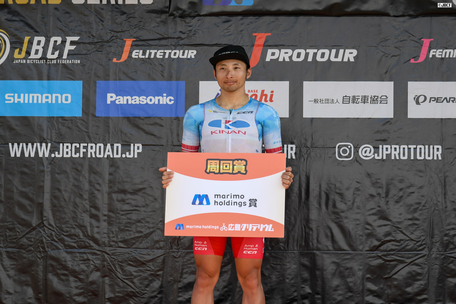クリテリウムリーダージャージは草場啓吾(KINAN Racing Team)が獲得。プレゼンターは株式会社マリモホールディングス代表取締役社長の深川真様とアビガール