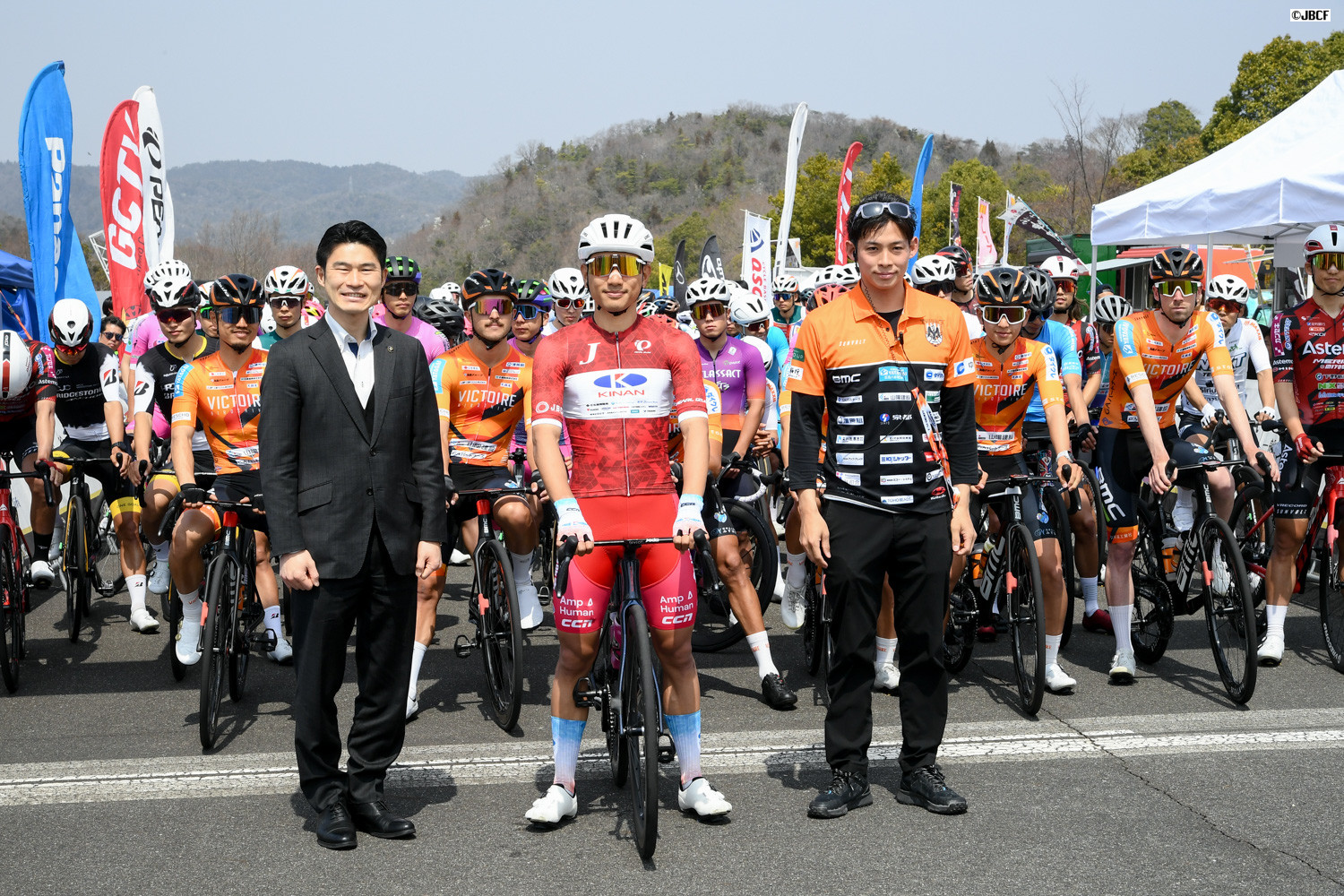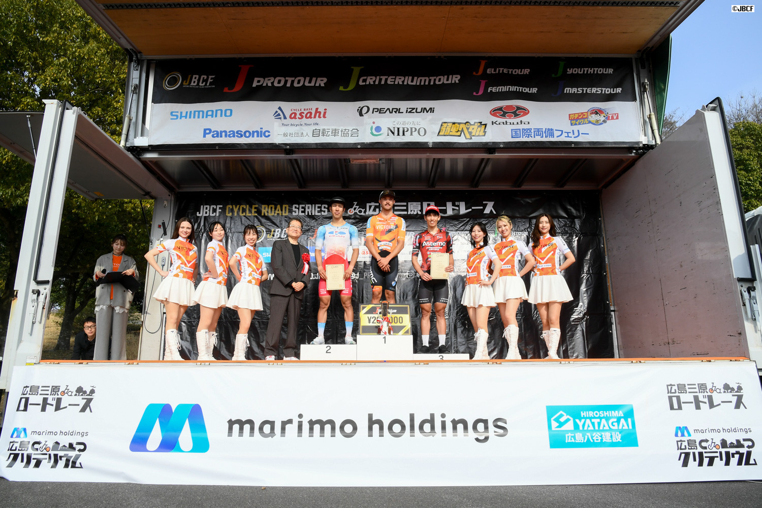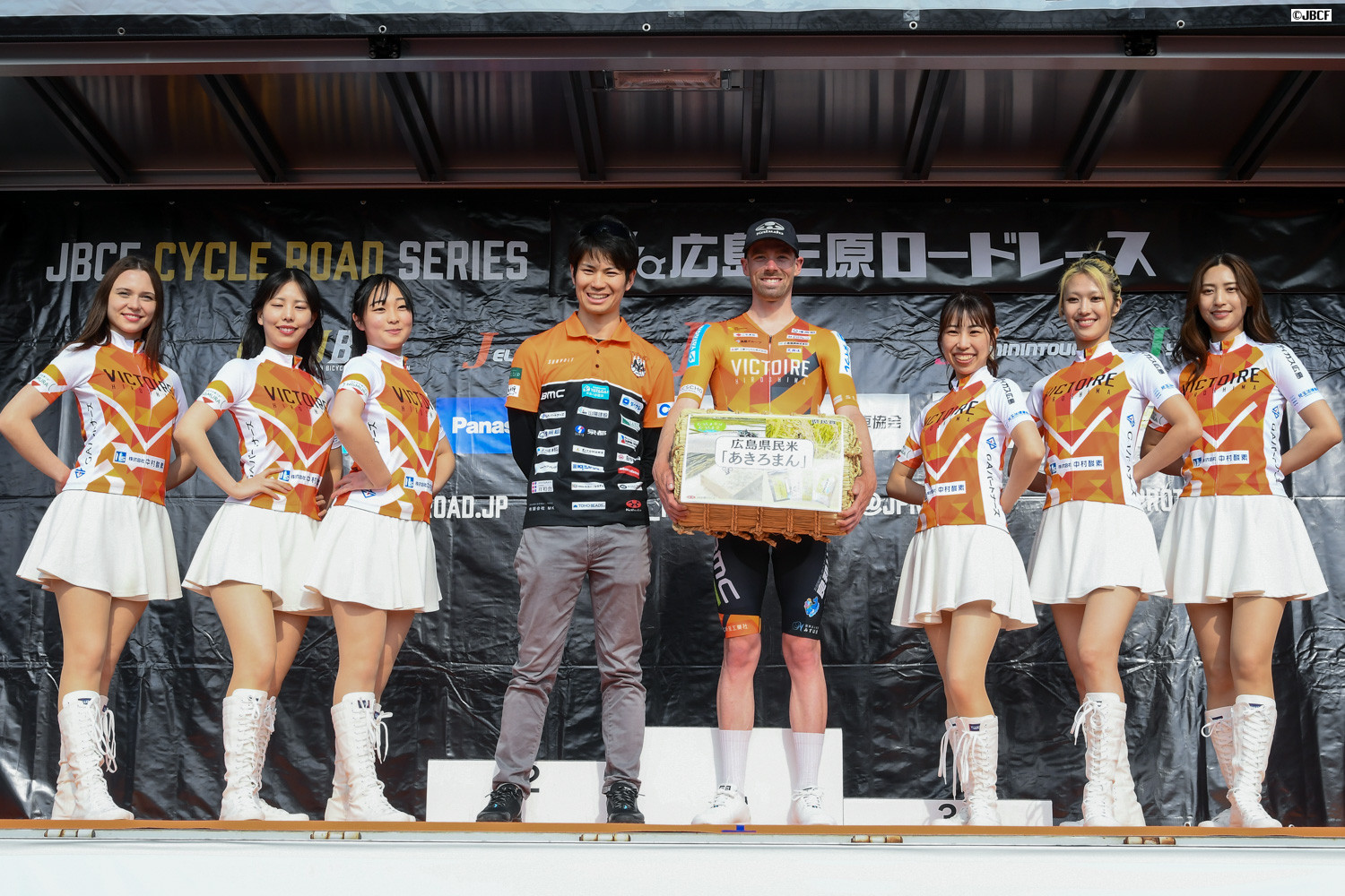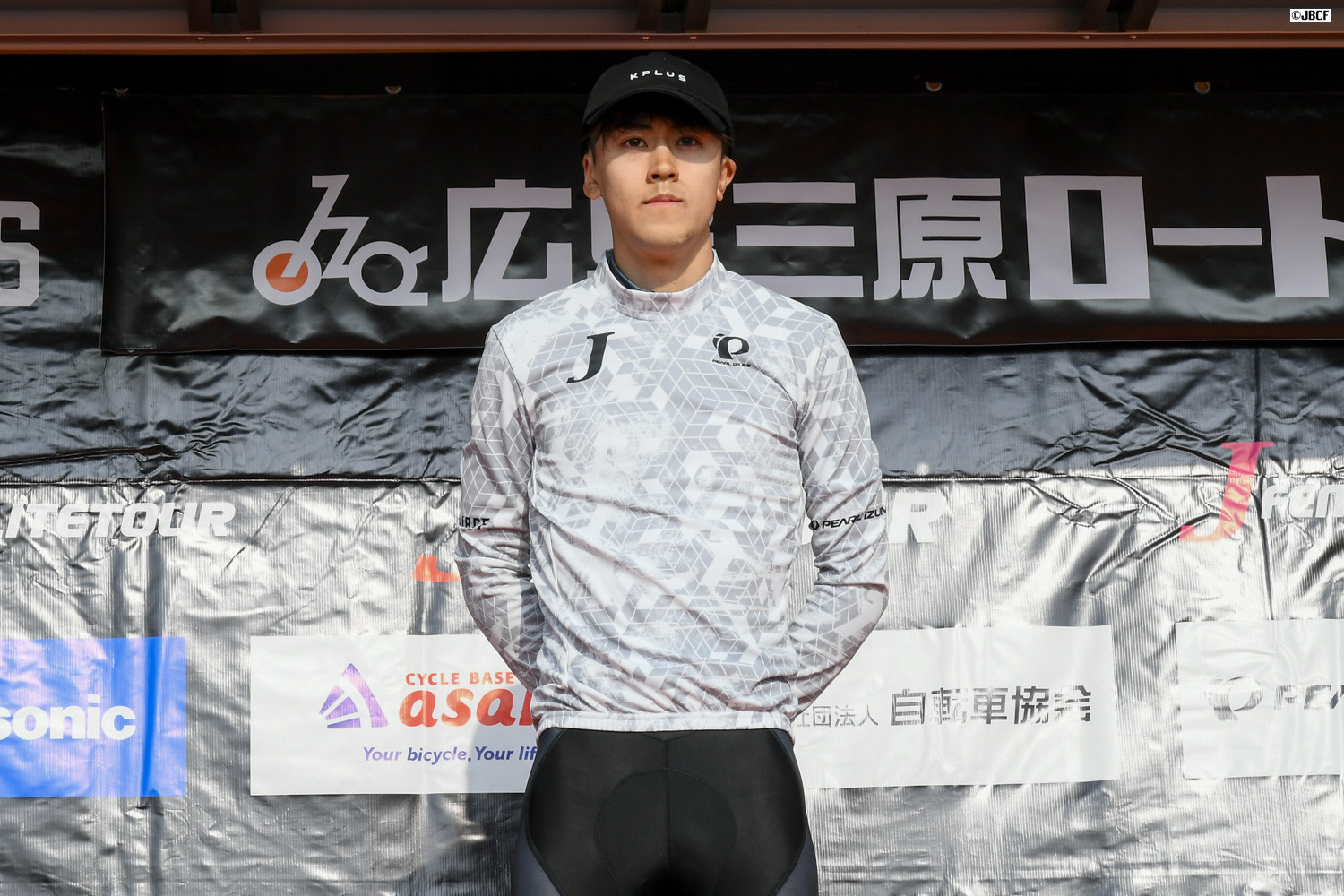 E1 エリートリーダージャージは望月綾人(CR3W)プレゼンターはヴィクトワール広島の藤川淳アンバサダーと吉本哲郎選手