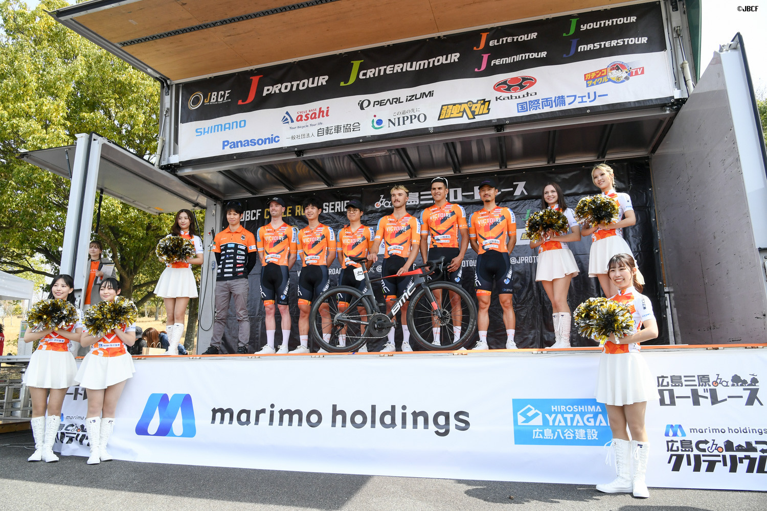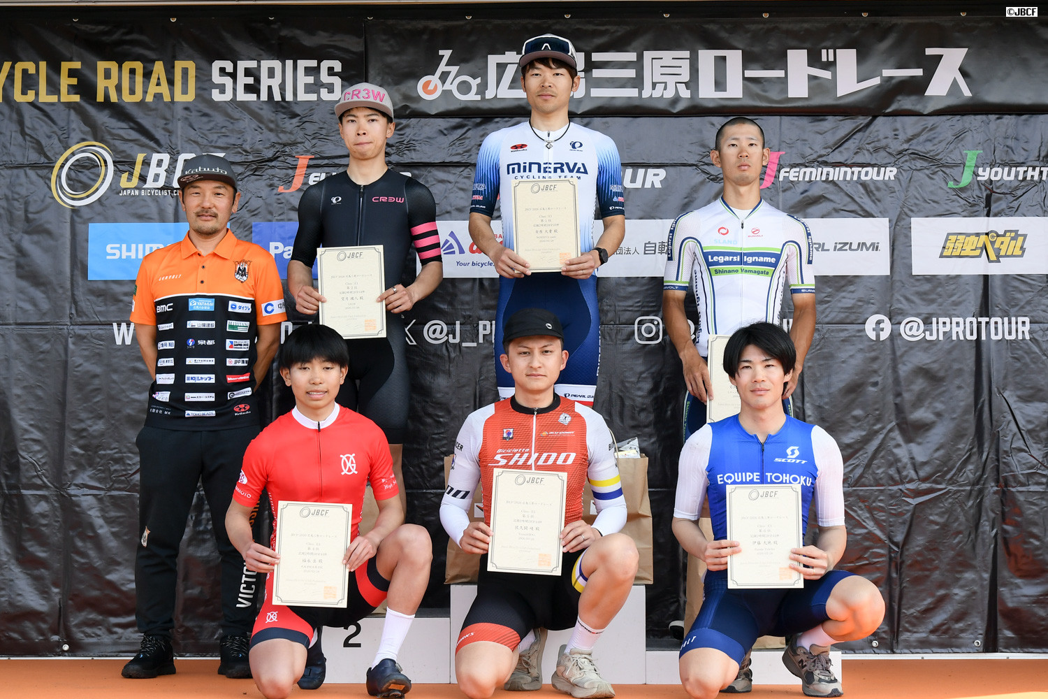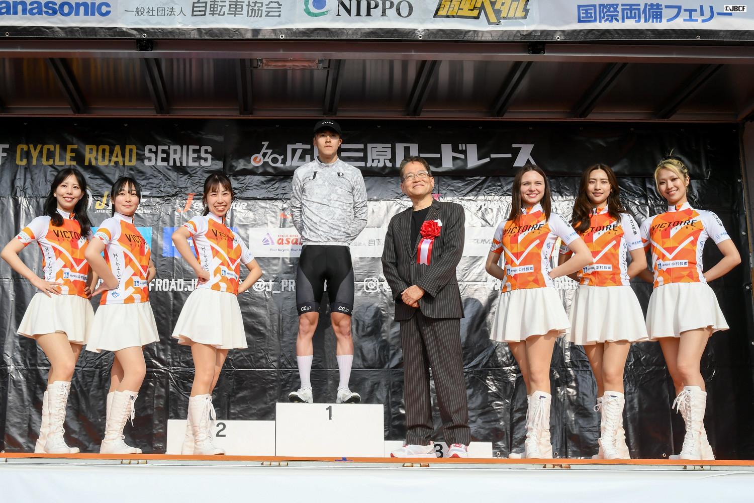 E1 エリートリーダージャージは望月綾人(CR3W)プレゼンターはヴィクトワール広島の藤川淳アンバサダーと吉本哲郎選手