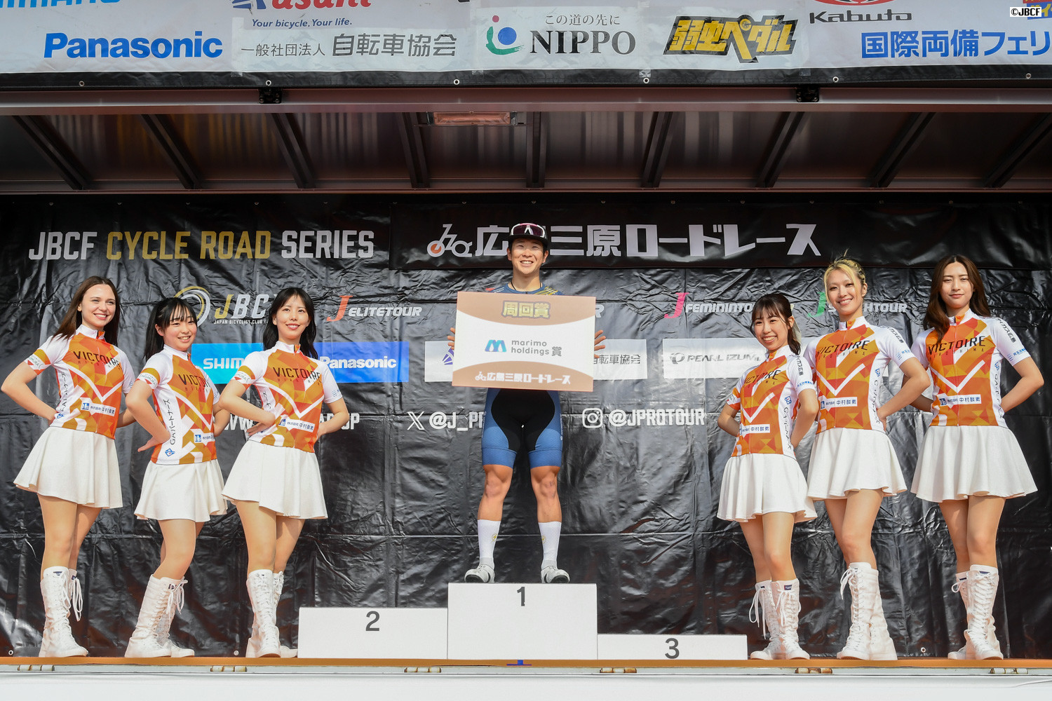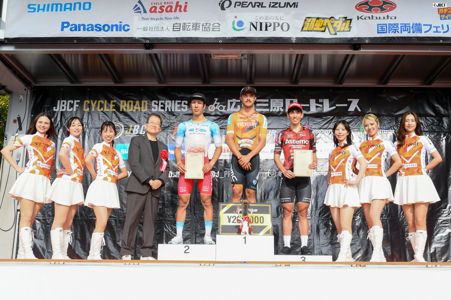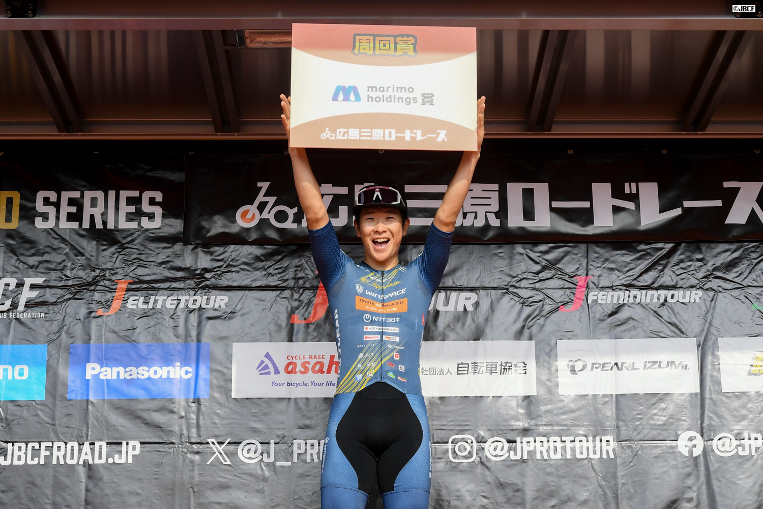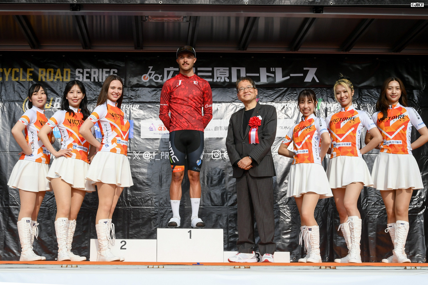 E1 エリートリーダージャージは望月綾人(CR3W)プレゼンターはヴィクトワール広島の藤川淳アンバサダーと吉本哲郎選手