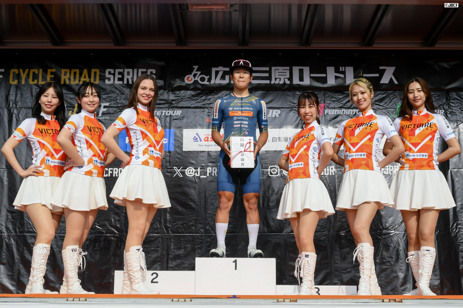 中間スプリント賞 金井健翔(Sparkle Oita Racing Team)プレゼンターはアビガール