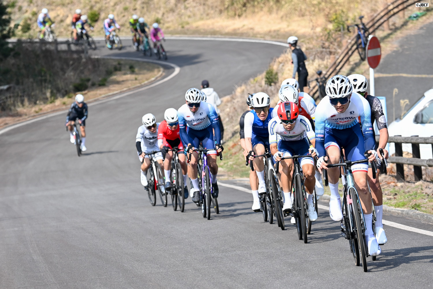 プロリーダージャージの草場啓吾(キナンレーシングチーム)の動きをヴィクトワール広島のメンバーがチェック
